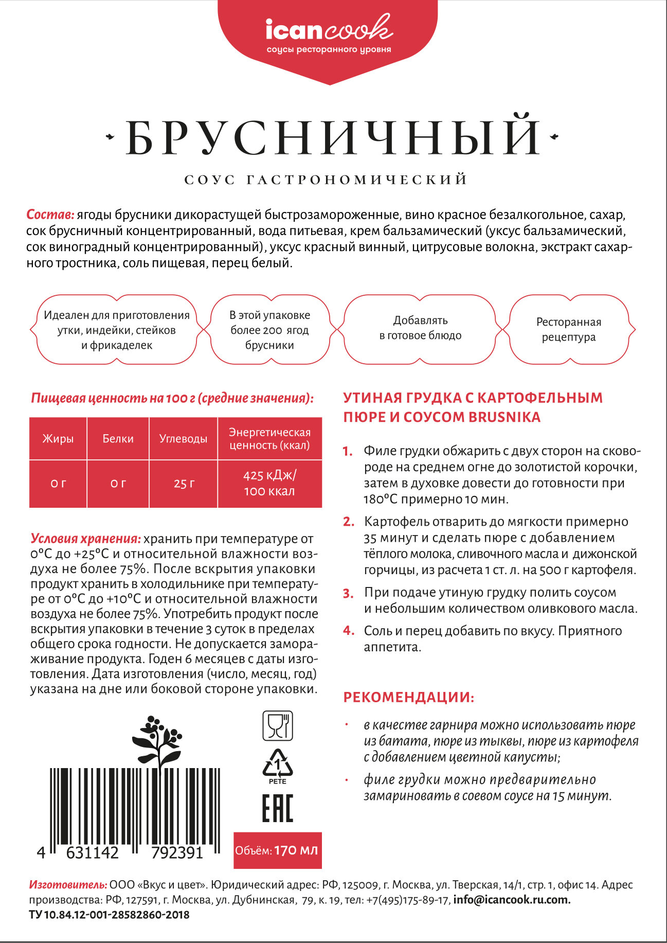 | Состав | ягоды брусники дикорастущей быстрозамороженные, вино красное безалкогольное, сахар тростниковый, пюре брусничное, вода питьевая, крем бальзамический (уксус бальзамический, сок виноградный концентрированный), уксус красный винный, цитрусовые волокна, соль пищевая, перец белый. |