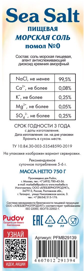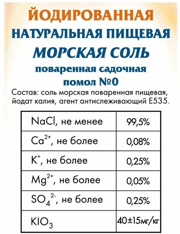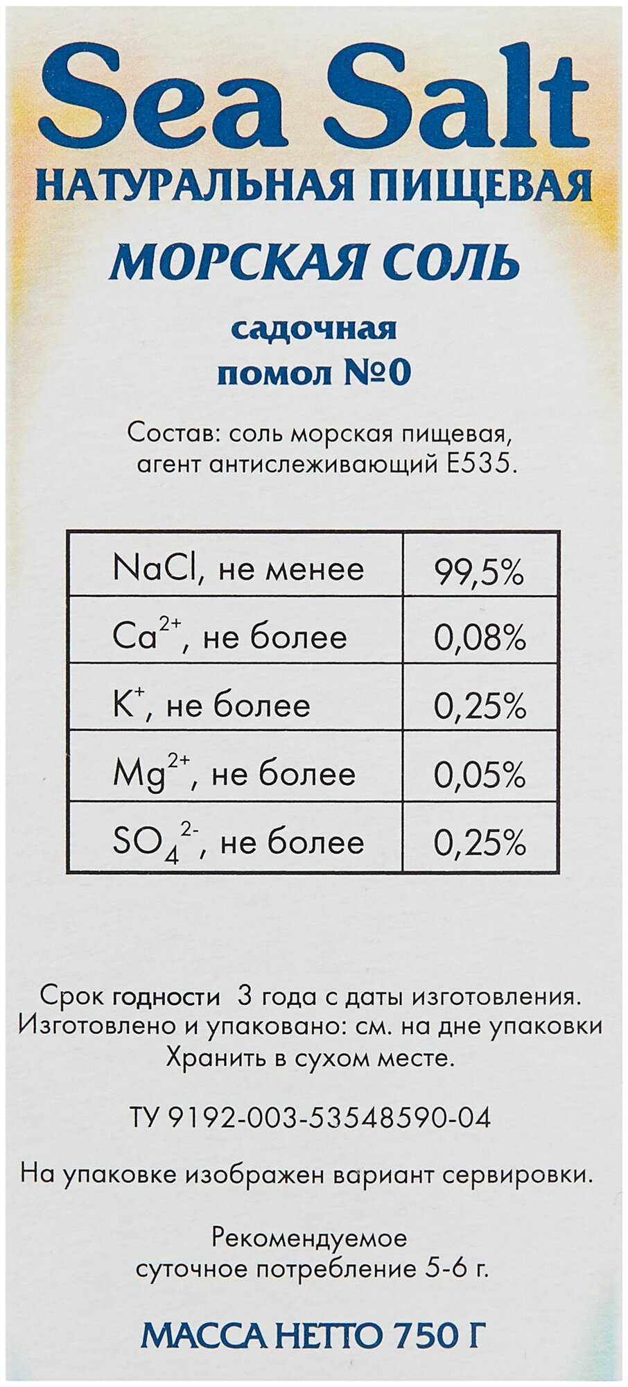| Состав | Соль морская поваренная пищевая, агент антислеживающий Е535. |