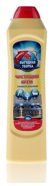 Крем чистящий выгодная уборка Универсальный 500мл Крем предназначен для удаления жира, трудновыводимых пятен и других въевшихся загрязнений с фаянсовых, эмалированных, керамических и нержавеющих поверхностей на кухне и в ванной комнате. Средство отлично справляется с сильными жировыми загрязнениями и нагаром. Легко смывается водой, не оставляя разводов на поверхности. Обладает дезинфицирующим действием, уничтожает стойкие неприятные запахи.