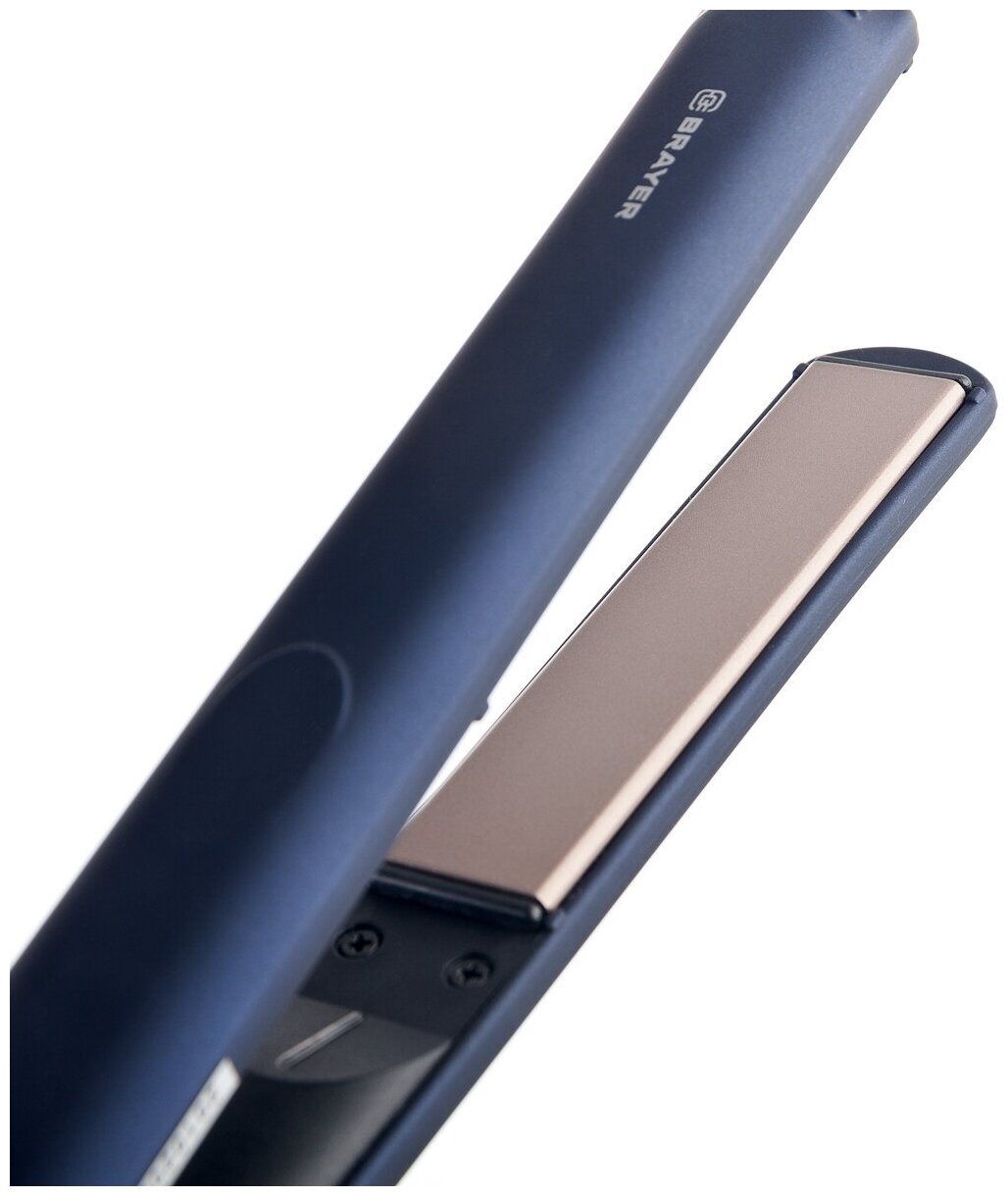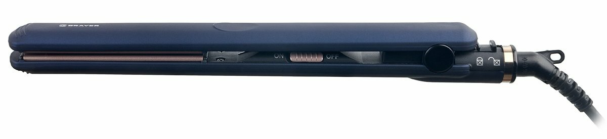 Выпрямитель для волос ''BRAYER'' представлен в лаконичном синем корпусе с керамическими пластинами 10 x 2,2 см. Прибор работает в одном режиме при нагреве до 220°C. С его помощью вы быстро распрямите непослушные волосы, превратив их в аккуратные гладкие локоны и не затратив много времени на создание стильной повседневной прически. Конструкция ''BRAYER'' дополнена небольшой петелькой для подвешивания. Также имеется удобный фиксатор для складывания. Прибор оснащен кабелем длиной 1,8 м, свободно вращающимся и не перекручивающимся во время использования.