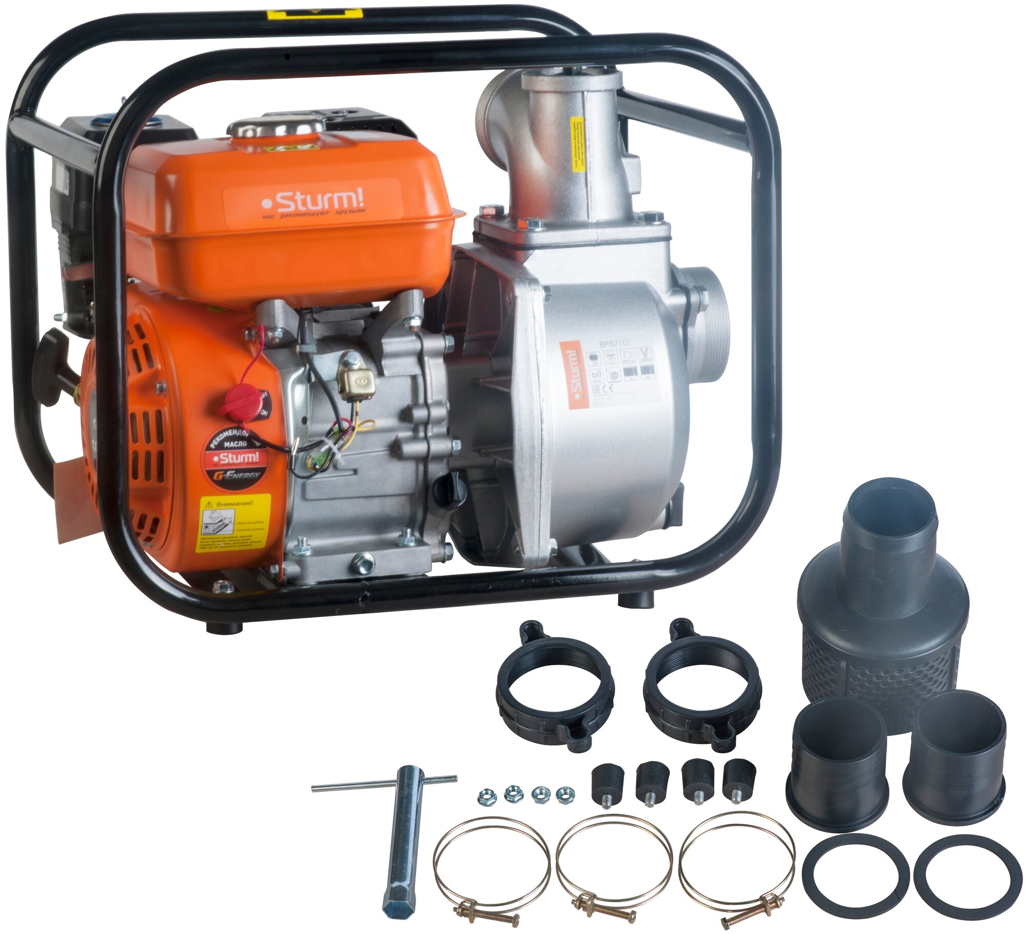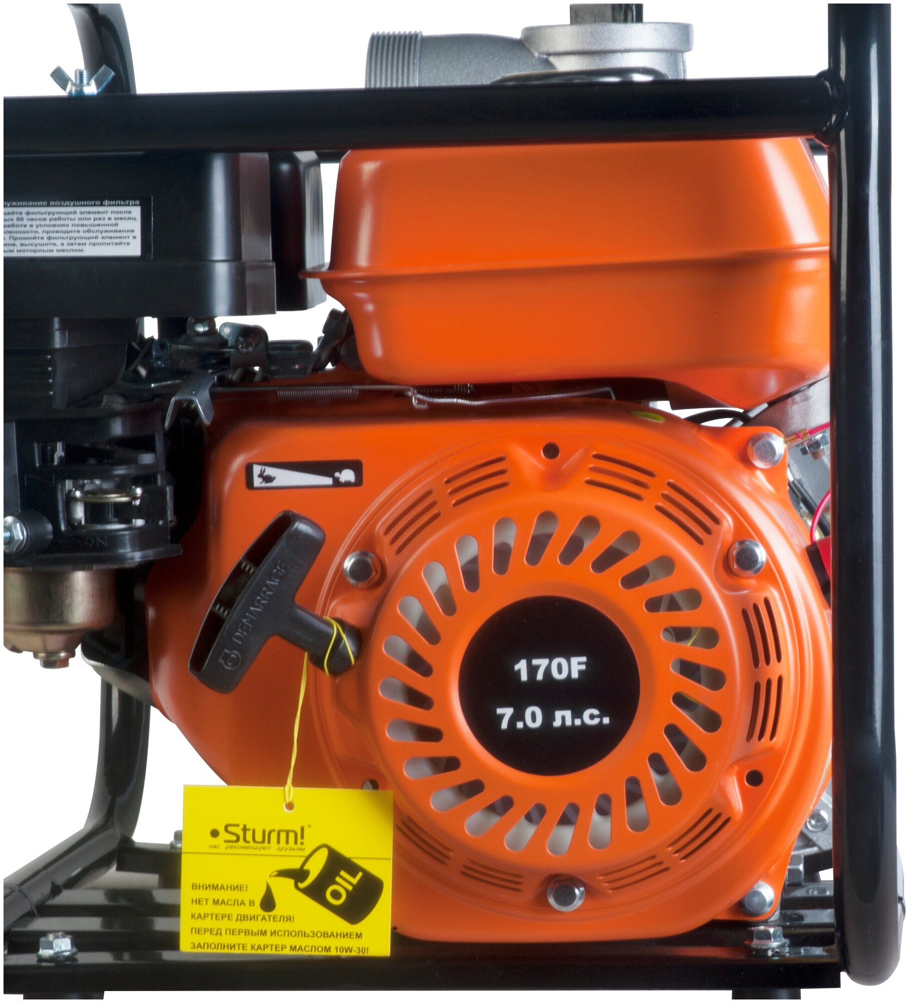 Sturm – высокопроизводительная универсальная бензиновая мотопомпа для домашнего, жилищно-коммунального или строительного применения. Имеет классическую компоновку: двигатель и насос смонтированы внутри прочной усиленной трубчатой рамы, страхующей основные узлы от случайных повреждений, при транспортировке. Мотопомпа оснащается четырехтактным бензиновым двигателем рабочим объемом 212 см3 (мощность 5,15 кВт / 7 л. с.) с верхним расположением клапанов (OHV) и воздушным охлаждением. Благодаря ряду технических решений: коленчатому валу повышенной прочности и усиленной цилиндро-поршневой группе, силовой агрегат надежен и неприхотлив в использовании. На модели Sturm установлен самовсасывающий насос центробежного типа, обеспечивающий высокую максимальную производительность 1000 л / мин – один из лучших показателей среди мотопомп аналогичной мощности. Агрегат способен осуществлять забор жидкости с глубины до 8 метров, что позволяет выкачивать воду из достаточно глубокого колодца