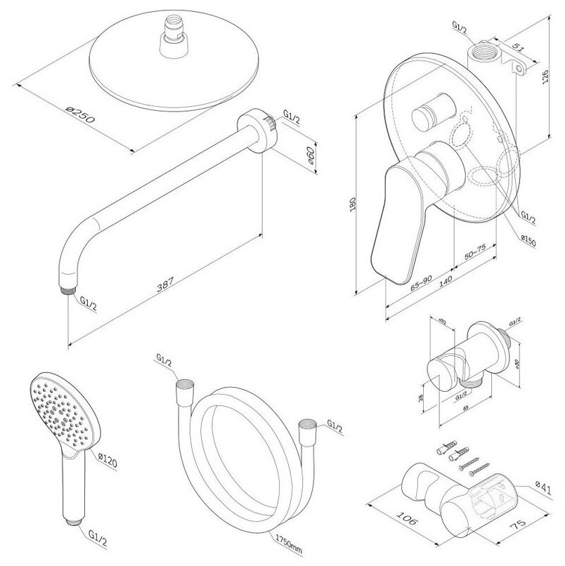 | Комплект поставки | смеситель для ванны/душа; держатель для ручного душа; держатель верхнего душа; шланг для душа; шланговое присоединение; верхний душ; ручной душ; крепеж; инструкция |