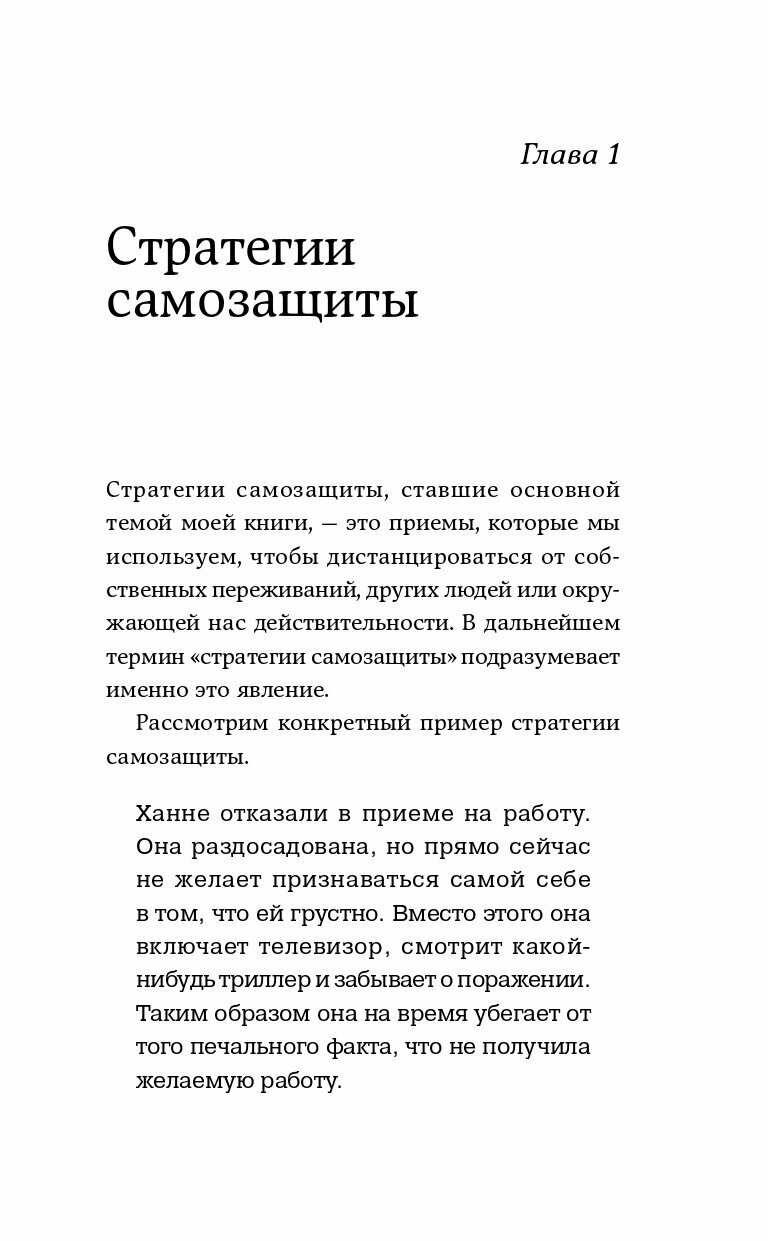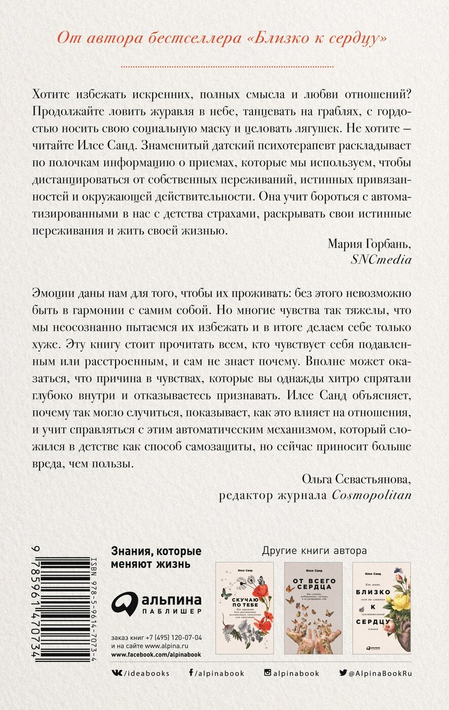 Датский психотерапевт Илсе Санд на примерах из жизни объясняет, как разные варианты психологической защиты не помогают, а, напротив, мешают нам жить полной жизнью и как можно от них избавиться. Прочитав эту книгу, вы поймете, как то, что вам говорили в детстве и юности, может влиять на ваши сегодняшние поступки и решения. Возможно, вы осознаете скрытые причины своих переживаний и наконец позволите вашим родным и близким стать по-настоящему родными и близкими вам людьми.