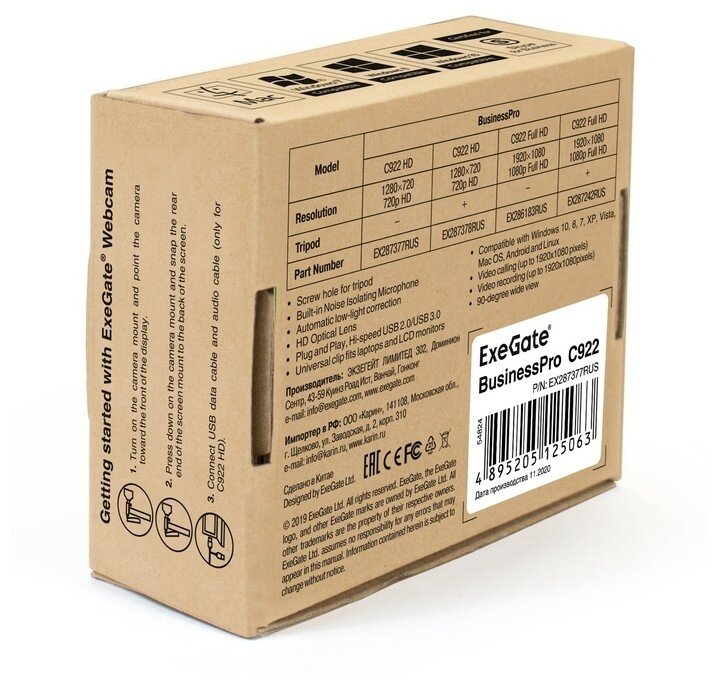 | Дополнительная информация | Веб-камера ExeGate BusinessPro C922 HD предназначена для удовлетворения стандартных потребностей бизнес-пользователей, предъявляющих высокие требования к качеству изображения, идеально подходит для использования как в бытовых целях, так и для использования в бизнесе., , Частота сменых кадров 30FPS; универсальное крепление; наличие резьбового отверстия для установки на штатив; подключение по USB 2.0; не требуется настройка (plug and play); совместимость с OC Win7, Win8, Win10, macOS10.10 или более поздними версиями, Chrome OS™, Android™ 5.0 или более поздними. |