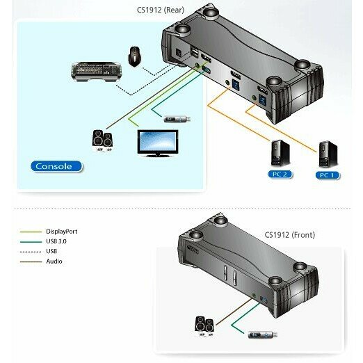KVM-коммутатор CS1912 позволяет пользователям получить доступ к двум компьютерам с интерфейсом DisplayPort, используя консоль с одной USB-клавиатурой, USB-мышью и монитором. Обладая легкостью в управлении коммутатор CS1912 предоставляет возможность использования трех удобных способов переключения — с помощью кнопок на передней панели, мыши или комбинации клавиш клавиатуры, обеспечивая гибкий и быстрый доступ к любому подключенному компьютеру.