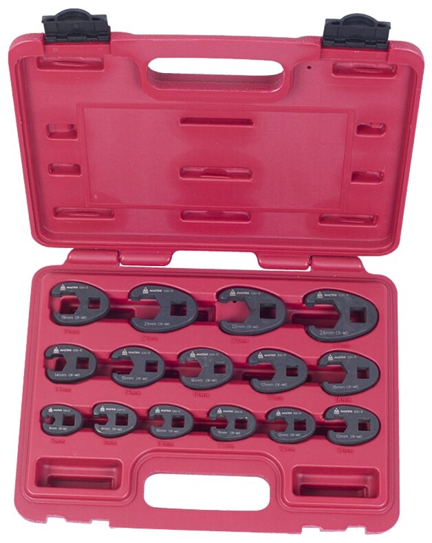 Набор разрезных ключей МАСТАК включает в свой состав разрезные ключи-насадки, которых – работа с крепежом, находящимся на трубках, длинных шпильках и прочим крепежом. Изготовлены из инструментальной хром-молибденовой стали с защитным воронёным покрытием, препятствующим воздействию коррозии.