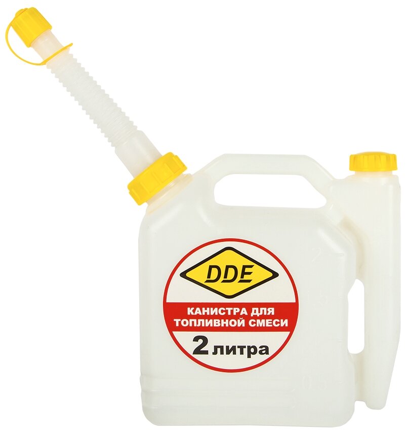 Канистра DDE предназначена для смешивания масла с бензином. Пользоваться данной канистрой очень удобно, так как она имеет дозатор, в который заливается необходимое количество масла. В саму канистру заливается бензин и все тщательно перемешивается. Наконечник для заливки топливной смеси поставляется в комплекте.Объём - 2 л.Материал канистры - пластик.Вид крышки - винтовая.Диаметр крышки - 32 мм.Вес канистры - 290 гр.ДхШхВ - 258х102х282 мм.