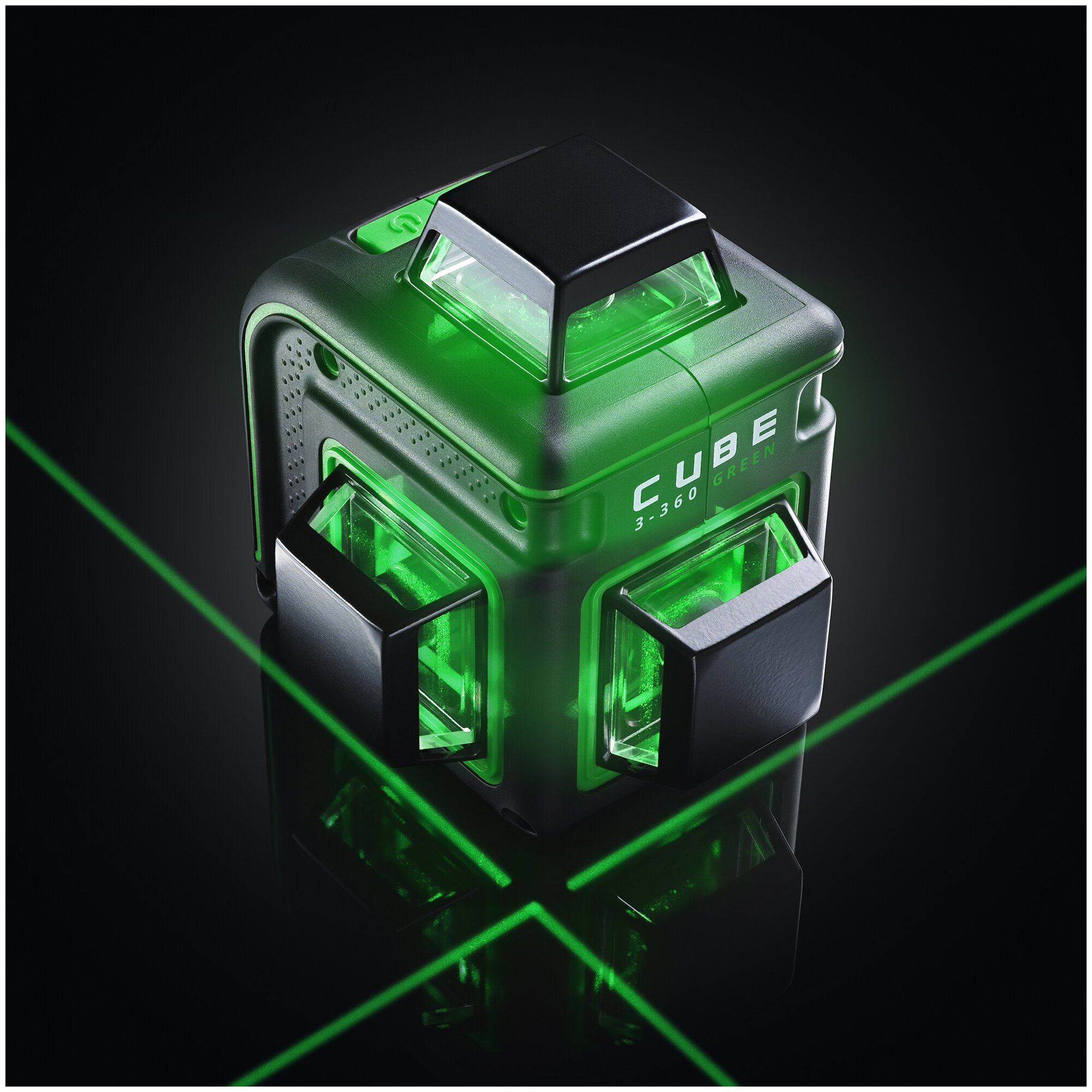 Лазерный уровень ADA CUBE 3-360 GREEN – самый компактный построитель трех лазерных плоскостей 360°. Благодаря специальному излучателю горизонтальный и вертикальные лучи проецируется на 360°. Три взаимно перпендикулярные плоскости позволяют выполнить абсолютно любую разметку. Идеально подходит при проведении строительных или ремонтных работ снаружи и внутри помещений. Яркий зеленый луч. Главное отличие ADA CUBE 3-360 GREEN заключается в использовании зеленого лазерного излучателя. Зеленый луч отлично подходит для разметки при ярком свете. Зеленую лазерную линию очень хорошо видно по сравнению с красной при равных условиях освещенности. Удобная разметка. Уровень проецирует три плоскости: одну горизонтальную и две вертикальных линии. Все линии имеют развертку 360°. Луч для разметки будет видно в любой точке. Больше нет необходимости вращать прибор. Достаточно установить ADA CUBE 3-360 GREEN на выбранной высоте. При включении вертикальных линий получается перекрещивающиеся под углом 90? плоскости. Очень удобно при выравнивании стен и углов между стенами. Лазерные линии можно поочередно отключать, оставляя только необходимые для работы. Точное выравнивание. Выравнивание уровня автоматическое. ADA CUBE 3-360 GREEN отличается высокой точностью – погрешность составляет всего 0,3 миллиметра на метр. Две точки крепления. ADA CUBE 3-360 GREEN можно крепить к штативу или настенному креплению при помощи резьбового соединения 1/4 дюйма. Одна резьба расположена на задней стенке прибора, вторая — снизу. Прибор можно установить на штативе или на универсальном креплении. Защищенный корпус. Весь корпус ADA CUBE 3-360 GREEN имеет протекторную защиту со всех сторон. Резиновые накладки оберегают прибор от поломок при падениях и ударах. Литиевый аккумулятор. Уровень работает от литиевого аккумулятора емкостью 1100 мAч. Использование аккумулятора значительно увеличивает время. Работа от зарядного устройства. ADA CUBE 3-360 GREEN может работать от обычных батареек, аккумулятора или зарядного устройства. Если аккумулятор или батарейки полностью разрядились, уровень ADA CUBE 3-360 GREEN может работать от зарядного устройства, включенного в бытовую сеть.