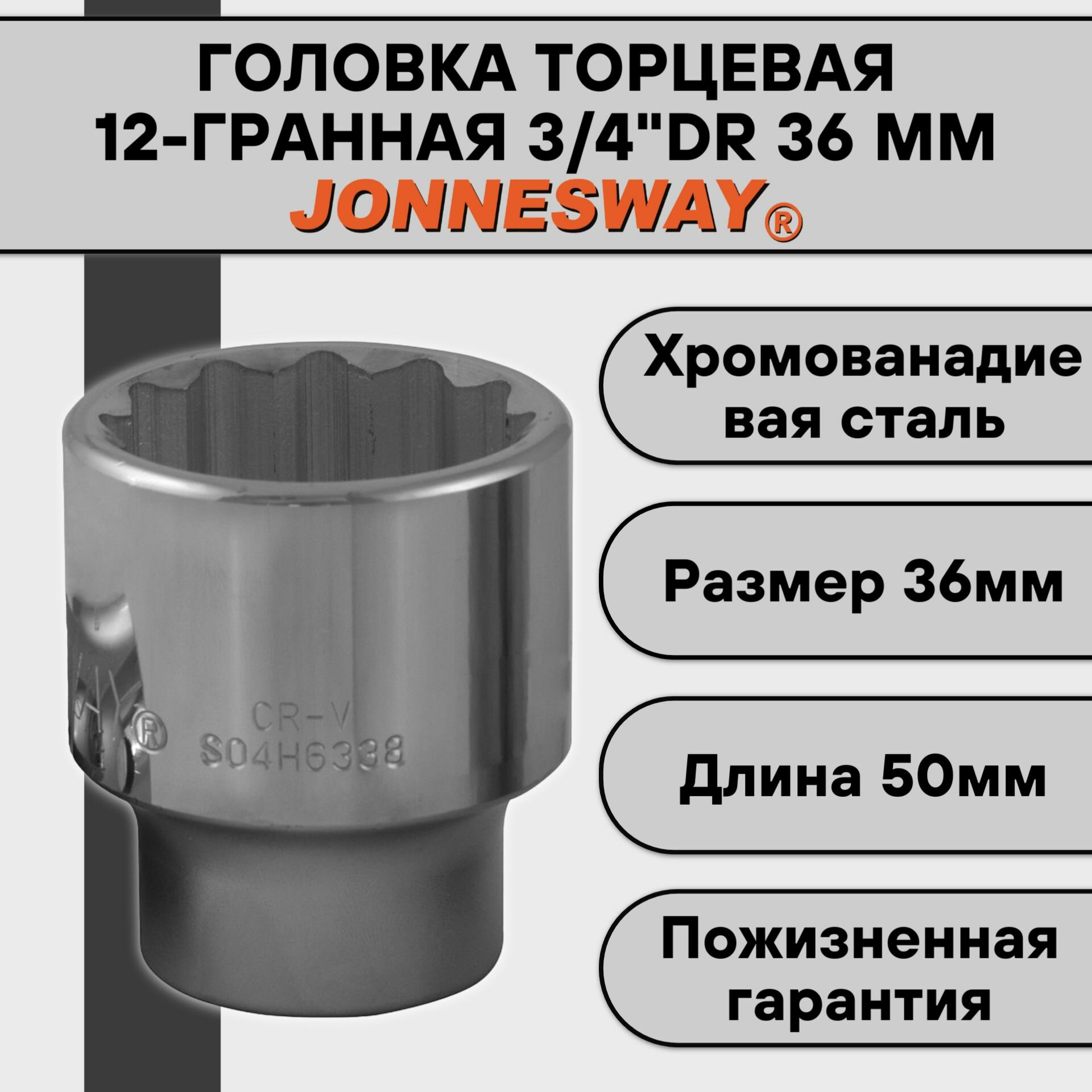 Торцевая головка Jonnesway размер 36мм, Н 58мм, s 3/4 (s04h6336)