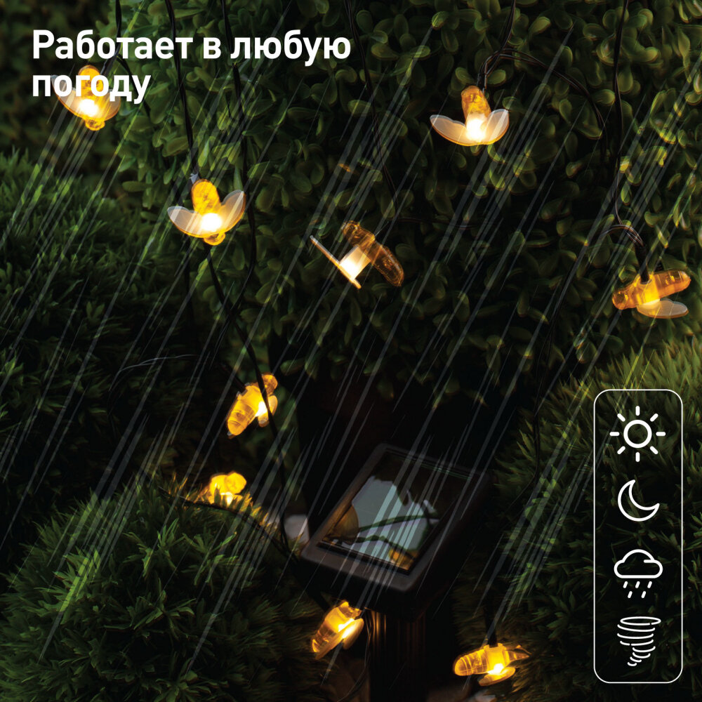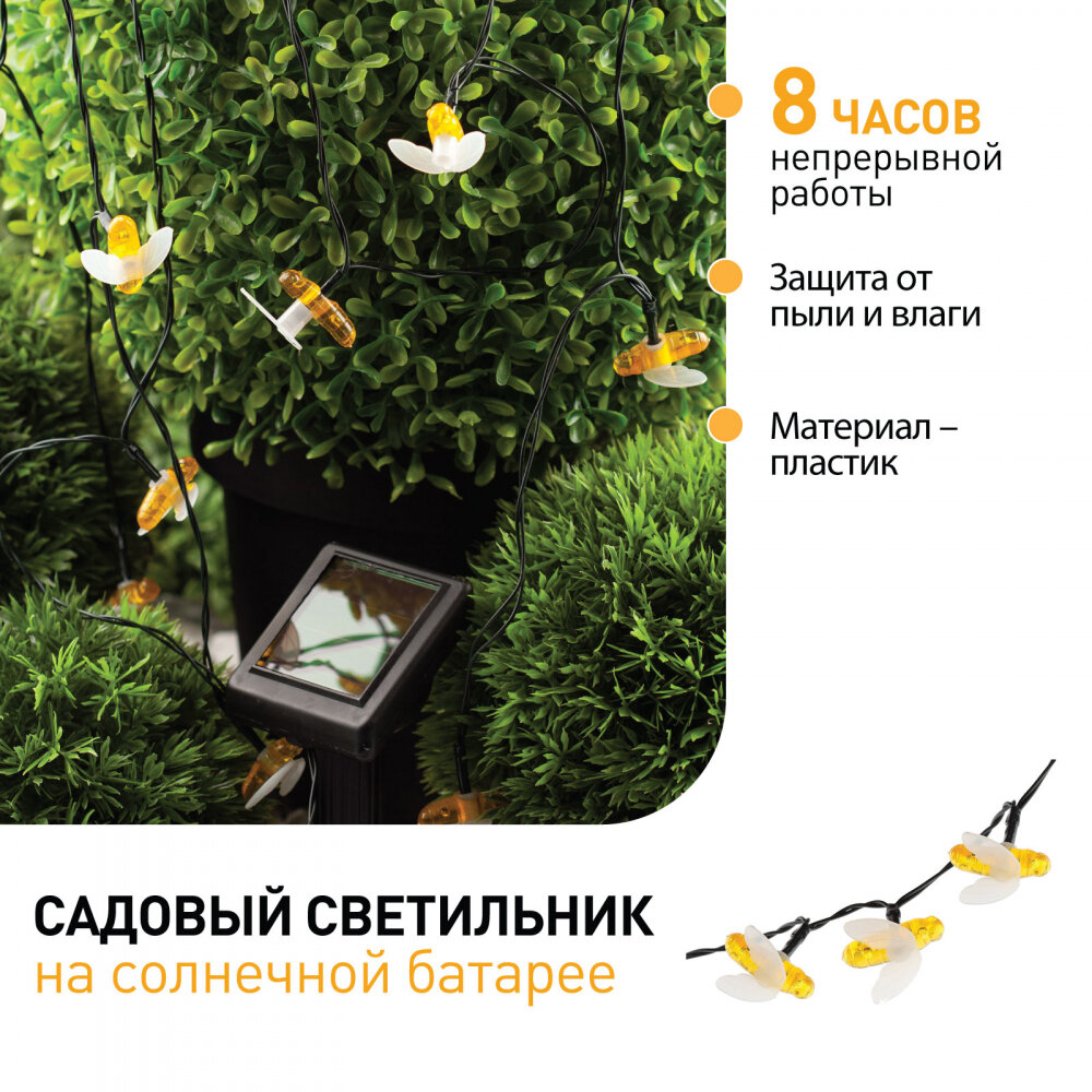 Уличная светодиодная гирлянда ERASG024-03 Пчелки станет ярким акцентом на Вашей дачной территории. Удобная конструкция и простая установка позволят Вам расположить гирлянду среди клумб, цветов и кустарников, красочно подсветить аллею, фасад здания или окно. Общая длина 5,8 м. Подсветка работает от солнечной батареи. Такой способ получения энергии является наиболее экологичным и энергоемким. Питание происходит во включенном режиме ON. С наступлением темноты маленькие пчелки загораются. Их животики заливаются желтым светом, создавая веселую атмосферу. Подсветка улицы может длиться непрерывно в течение 8 часов. Высокая степень пыле и влагозащиты позволяет оставлять светильник на улице даже во время дождя. Обращаем Ваше внимание, что перед использованием фигурки её необходимо включить и зарядить. Светильник заряжается в течение всего светового дня. Создавайте уникальное вместе с гирляндой Пчелки на солнечной батарее от производителя ЭРА!