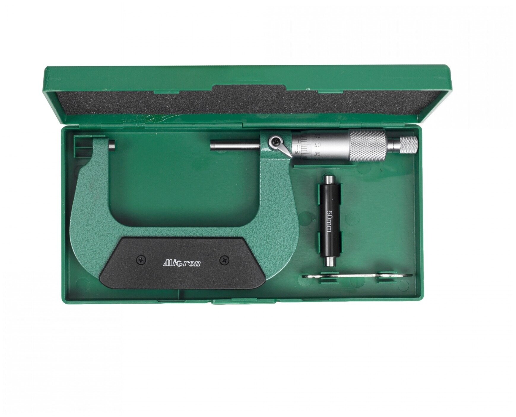 Микрометр *- измерительный прибор для высокоточного (с погрешностью от 2 до 50 мкм) определения линейного размера. Использование микрометра возможно в любой производственной области, где требуется определение размеров детали – механическая обработка, точная сборка, настройка оборудования и др. Конструкция микрометра состоит из трех основных элементов: Рамы в виде полукруга для фиксации измеряемой детали; Ручки с трещоткой и неподвижным стеблем со шкалой и измерительным барабаном; Винта с неподвижной гайкой для измерения величинЗамер с помощью микрометра выполняется посредством перемещения винта в неподвижной гайке. Цифровые микрометры (МКЦ) оснащенные электронным измерительным устройством, пользуются популярностью благодаря удобству и точностью измерения, а также дополнительными возможностями инструмента: Возможность производить замер с точностью до 1 мкм (с погрешностью до 0,1 мкм); Встроенная калибровка; Цифровое табло для быстрого и точного получения результата; Переключение между метрической и дюймовой системами;