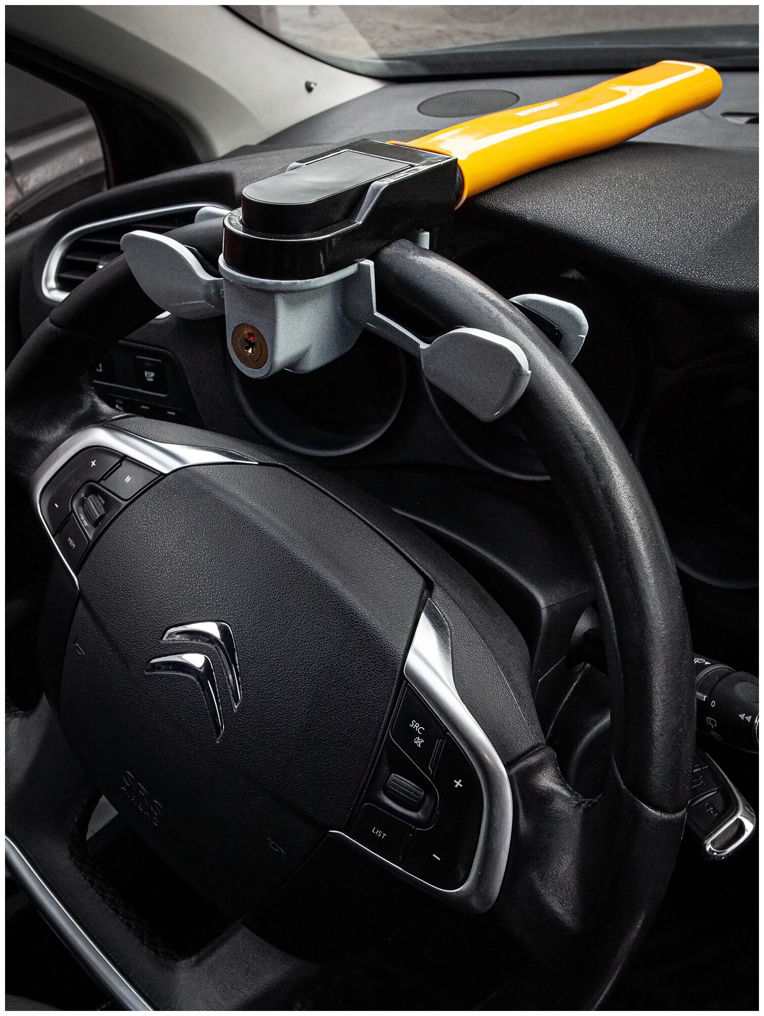 Противоугонное устройство, механический замок для фиксации руля к панели приборов. Блокиратор руля, фиксируется ключом. Установка и снятие занимает меньше минуты. Противоугонный механический замок Руль-Торпедо, комплект AUTOVIRAZH обеспечивает безопасность автомобиля. Это может быть основным или второстепенным средством защиты. При необходимости владелец может быстро установить или демонтировать его. Максимальная толщина руля - 3см. Длина захватной части руля 14см.