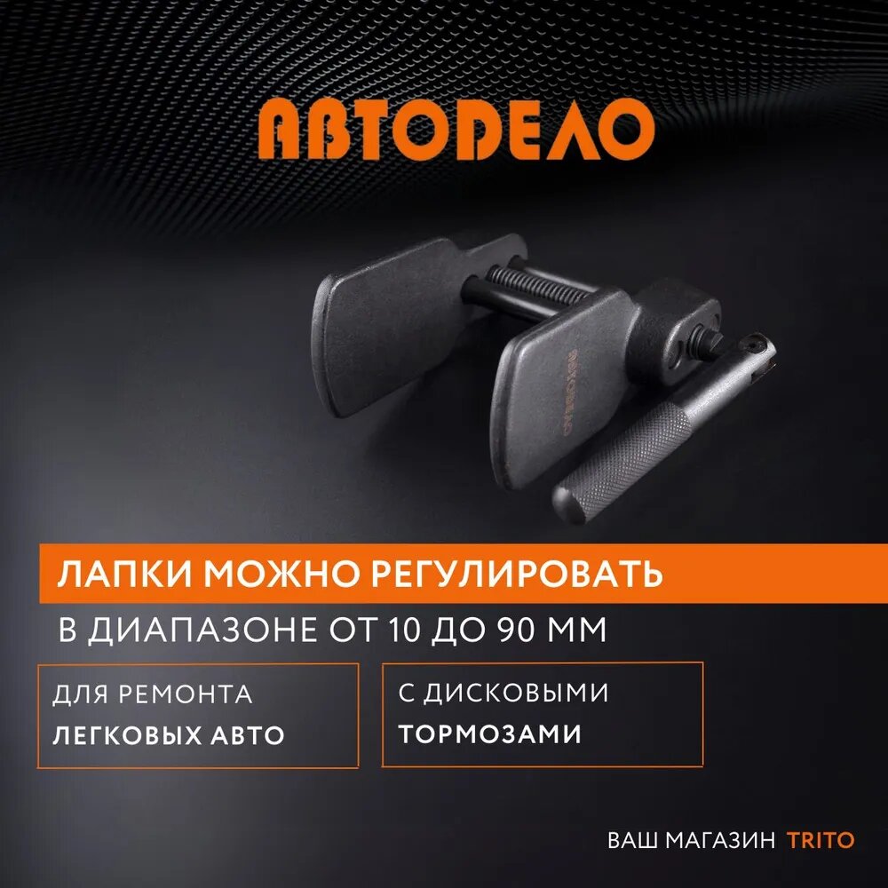 Применяется для утапливания тормозных цилиндров легковых автомобилей с дисковой тормозной системой. Используется для передних тормозных цилиндров, а также для задних тормозных цилиндров, не требующих вращения в процессе утапливания. Рабочие лапки приспособления изготовлены методом горячей штамповки (ковки на молотах). Поставляется в индивидуальной картонной коробке.