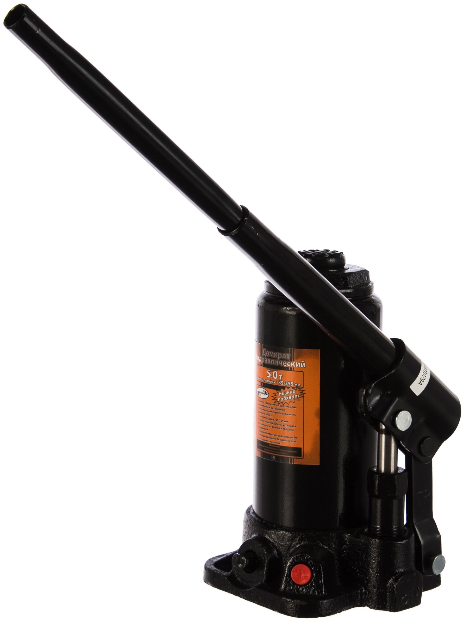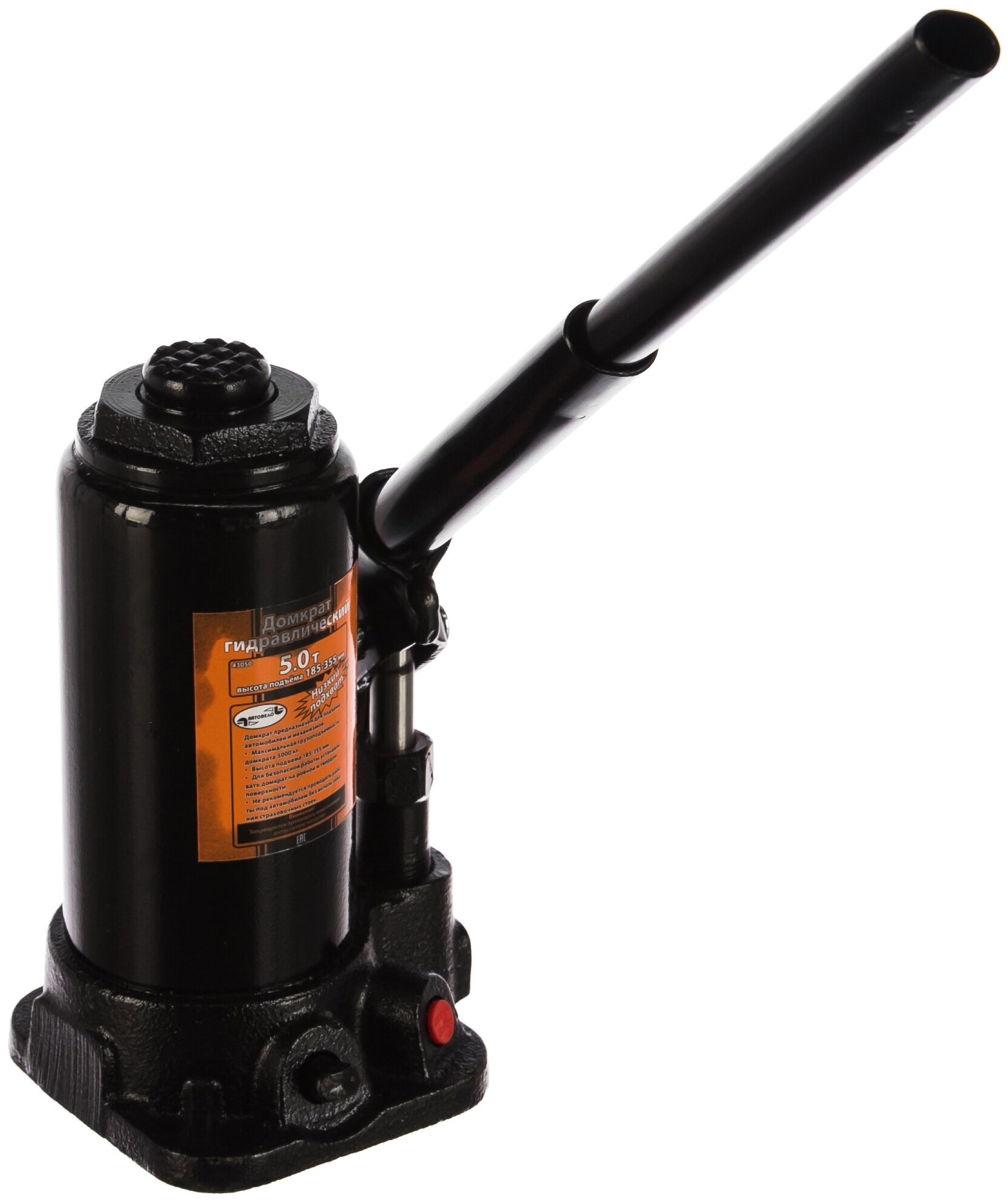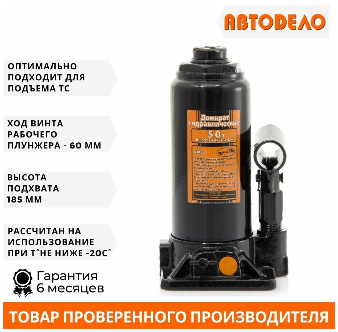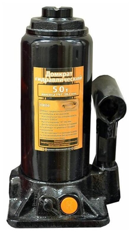 Домкрат гидравлический бутылочный 5 тонн, 200-405 мм АвтоDело - бутылочный домкрат, способный поднимать транспортные средства (с низким клиренсом) и не только для проведения ремонта, масса которых не превышает 5 тонн. Особенности: Домкрат гидравлический бутылочный прост в обслуживании и надежен в эксплуатации. Безопасность бутылочных домкратов Автодело обеспечивается с помощью защиты от перегрузки - это значит, что домкрат не позволит поднять массу, которая превышает максимум. В комплект насоса входит рукоятка привода гидравлического насоса. Данная модель бутылочного гидравлического домкрата обладает низким подхватом - это значит, что маленькая высота подхвата, равная 200 мм, позволяет использовать его с машинами, имеющими небольшой клиренс. Грузоподъемность 5 тонн Высота подхвата 200 мм Высота подъема 405 мм Защита от перегрузки Есть Рабочий ход 110 мм Количество штоков 1 Ход плунжера 125 мм Ход выдвижного винта 80 мм Материал корпуса Металл Кейс Нет Вес изделия брутто 5 кг Преимущества АвтоDело : Надежность домкрата гарантирует его усиленная конструкция. Встроенный предохранительный клапан защиты от перегрузки позволяет предотвратить избыточное давление и, тем самым, предохраняет домкрат от поломки. Гидравлическую составляющую насоса можно применять, когда температура окружающей среды находится в диапазоне от минус 20 до плюс 50 градусов Цельсия. Домкрат оснащён дополнительным винтом рабочего плунжера.