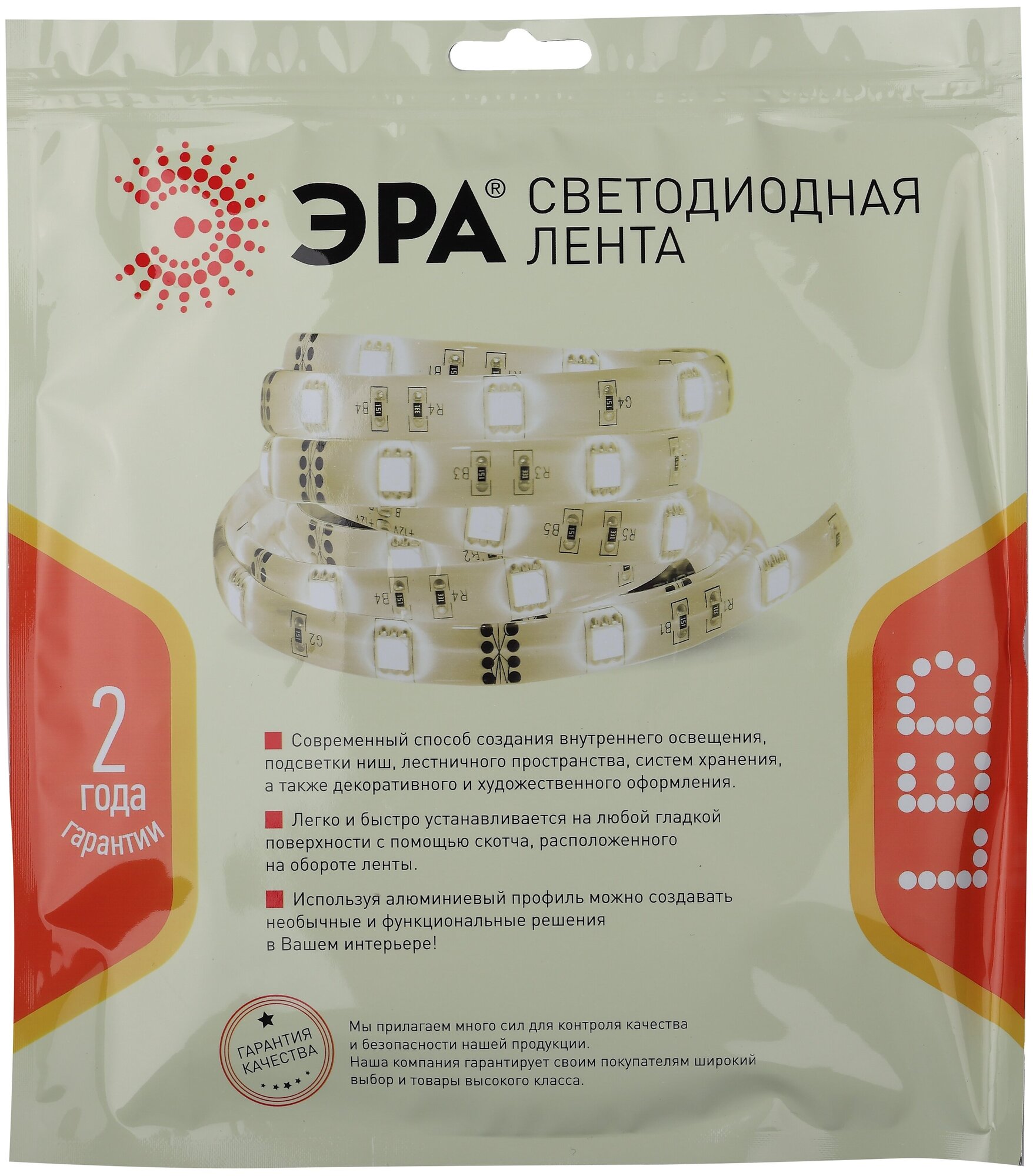 Высококачественная светодиодная лента ЭРА с гарантией 2 года. Рекомендуется для установки в помещениях. Для продления срока службы устанавливайте ленту на анодированный алюминиевый профиль. Подключение осуществляется с помощью источника питания (не входит в комплект поставки). Внимание: во избежание выхода из строя не допускается длительная работа ленты в смотанном виде!