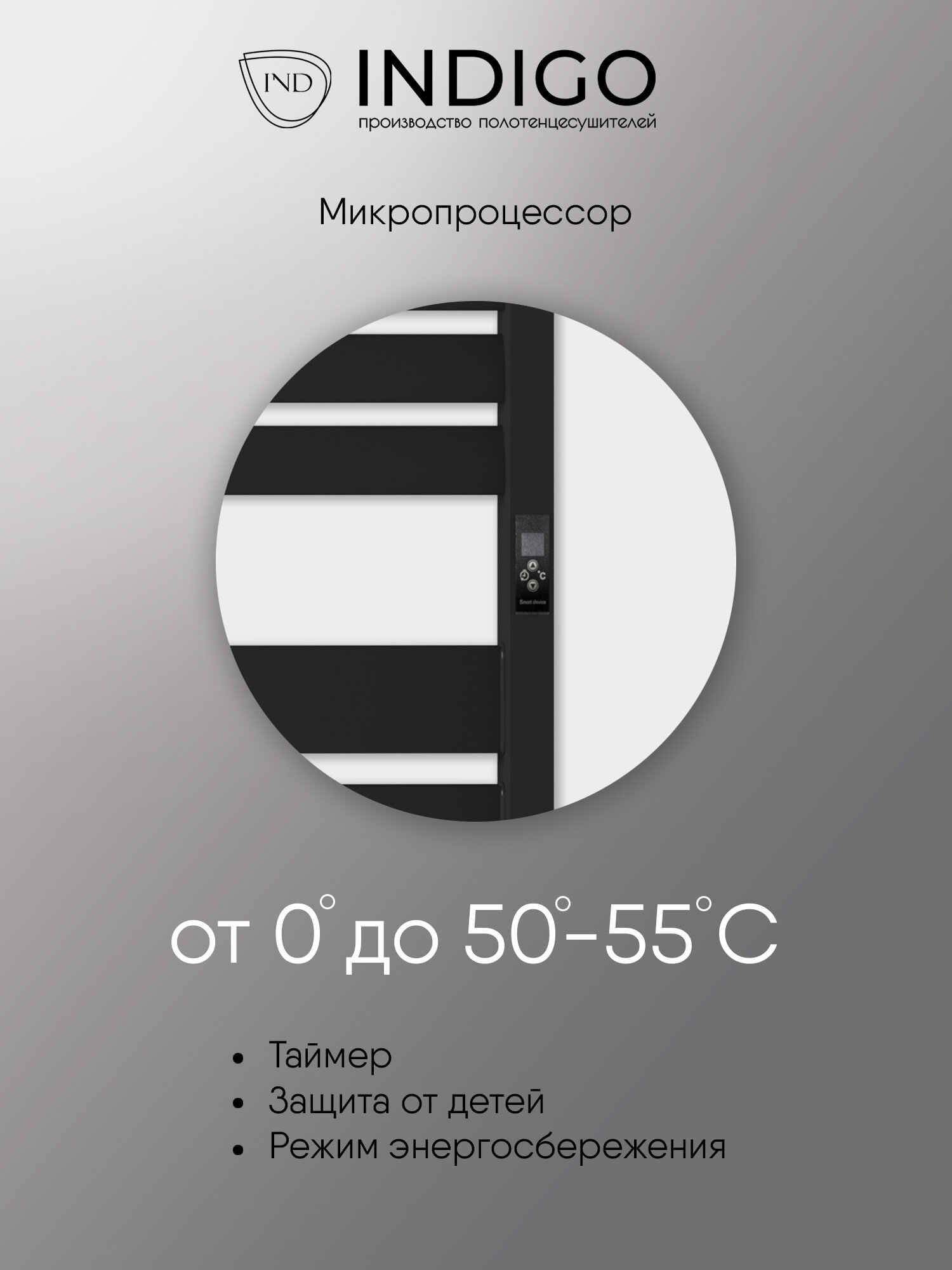 Современный электрический полотенцесушитель премиум класса торговой марки INDIGO Titan с прямым коллектором и стандартным подключением. Витой шнур органично и аккуратно смотрится с полотенцесушителем. На коллекторе расположен микропроцессорный терморегулятор. Кнопка вкл/выкл. находится на регуляторе. Стильный внешний вид изделия эргономично дополнит интерьер помещения.