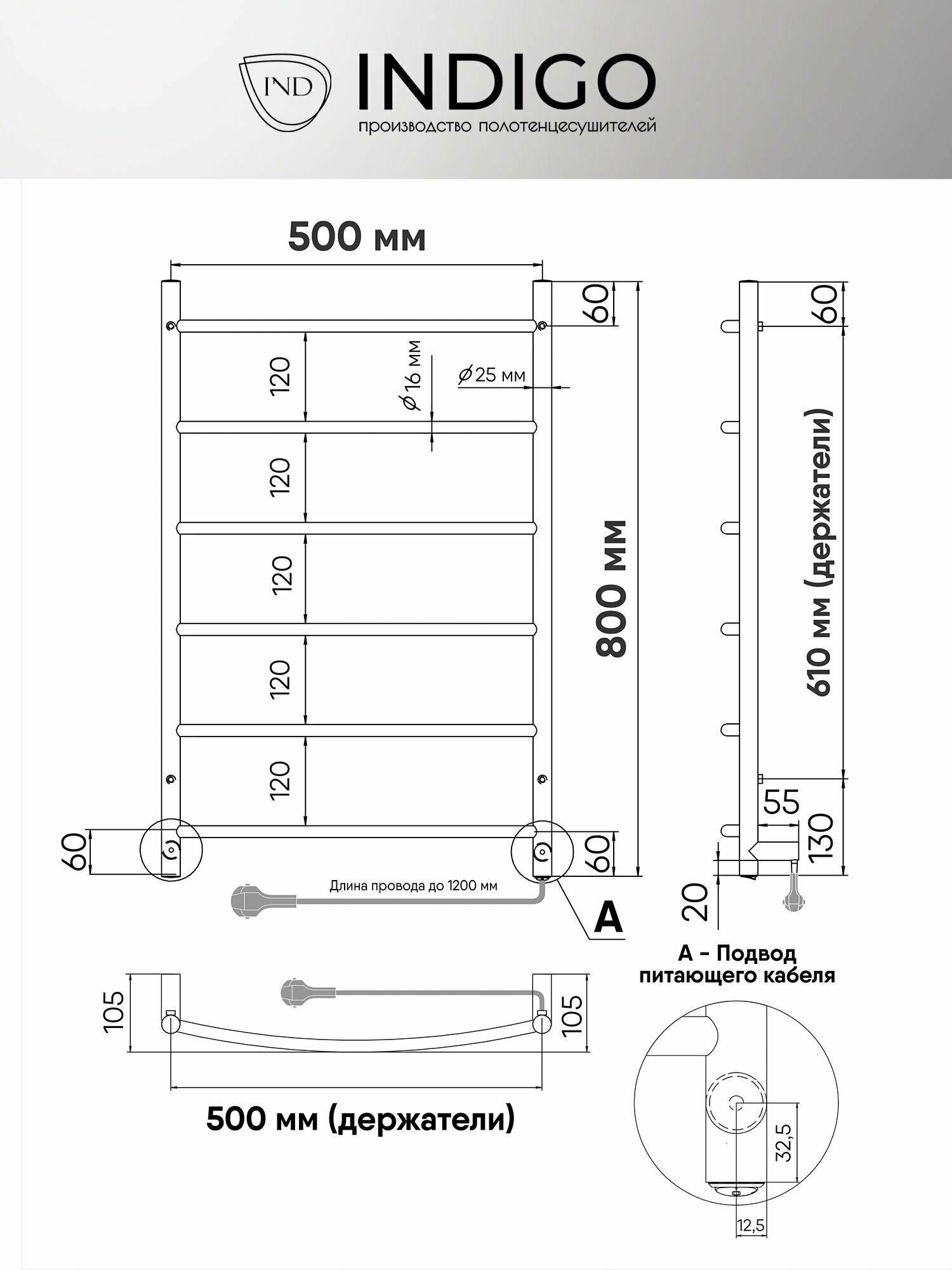 Полотенцесушитель электрический INDIGO Arc в размере 800х500 (ВхШ) выбирают за его классический вид – лесенки и универсальность. Модель оснащена кнопкой включения на нижней части стойки. Универсальность изделия предусматривает подключение через прямой провод, который переставляется на нужную вам сторону или скрытое подключение без покупки дополнительного переходника. Длина прямого провода 1 метр. Изделие окрашено порошковой краской по специальной технологии. Полотенцесушитель Arc относится к энергоэффективным изделиям, потребляемая мощность в данном размере 75 Вт. Специальная технология нагревательного кабеля защищает полотенцесушитель от перегрева что влияет на длительные сроки службы. В комплектации идут 4 телескопических держателя, комплект для монтажа и гарантийный паспорт. Полотенцесушитель INDIGO Arc застрахован и имеет гарантию 3 года. Выбирая INDIGO вы получаете надежный продукт из стали с гарантией качества от Российского производителя.
