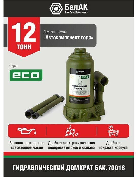 Домкрат ECO 12 тонн «БелАК» разработан российским производителем «БелАК», награждённым двумя национальными премиями «Автокомпонент года» и «Автоаксессуар года» за высокое качество и надежность выпускаемых домкратов. Продукция «БелАК» соответствуют нормам сертификации ISO9001 и ЕАС.