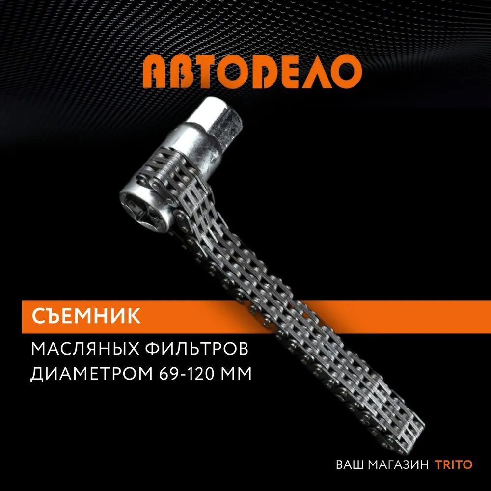 Съемник масляного фильтра цепной 69-120мм. АВТОДЕЛО (АвтоDело) . Ключ масляного фильтра цепной АВТОДЕЛО приедназначен для снятия соответствующих фильтров диаметром до 120мм. Возможна работа как гаечным ключом или торцевой головкой на 21мм, так и воротком с присоединительным квадратом 1/2". Буксировочные тросы, динамические стропы, рывковые тросы, автомобильные компрессометры, стартовые провода, зарядные устройства автомобильные держатели, шприцы для смазки, мультиметры цифровые, рычажные масленки, воронки для бензина, пакеты для колес, чехлы для шин, насосы ножные, наборы для ремонта шин, манометры автомобильные шинные.