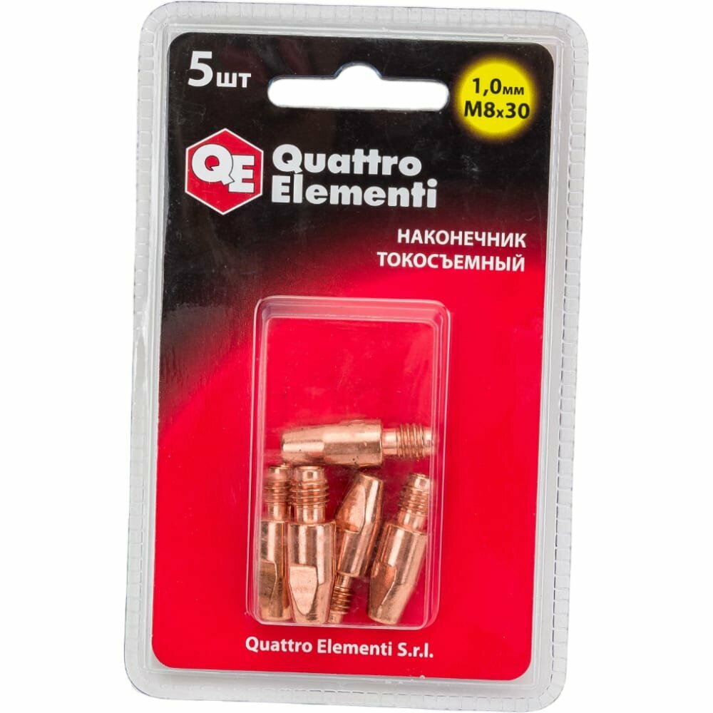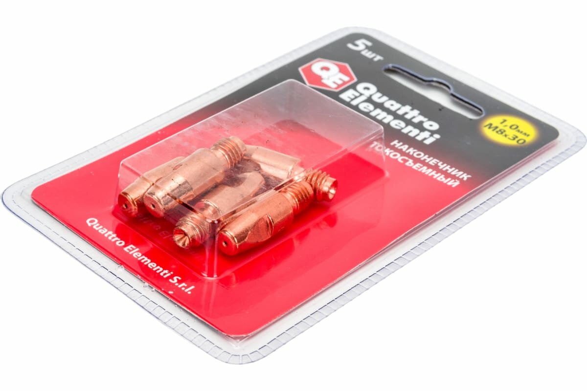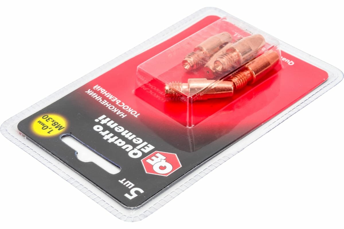 Наконечник токосъемный QUATTRO ELEMENTI M8x30 1.0 мм (5 шт) в блистере, для горелки полуавтоматаНаконечник токосъёмный QUATTRO ELEMENTI 771-275 является сменным элементом для полуавтоматических горелок. Предназначен для точной подачи проволоки и формирования качественной сварочной дуги. Подсоединяется к держателю наконечника с помощью резьбы — М8. Изготовлен из меди, что обеспечивает надежность и долговечность использования. Количество — 5 шт. Упаковка — блистер.