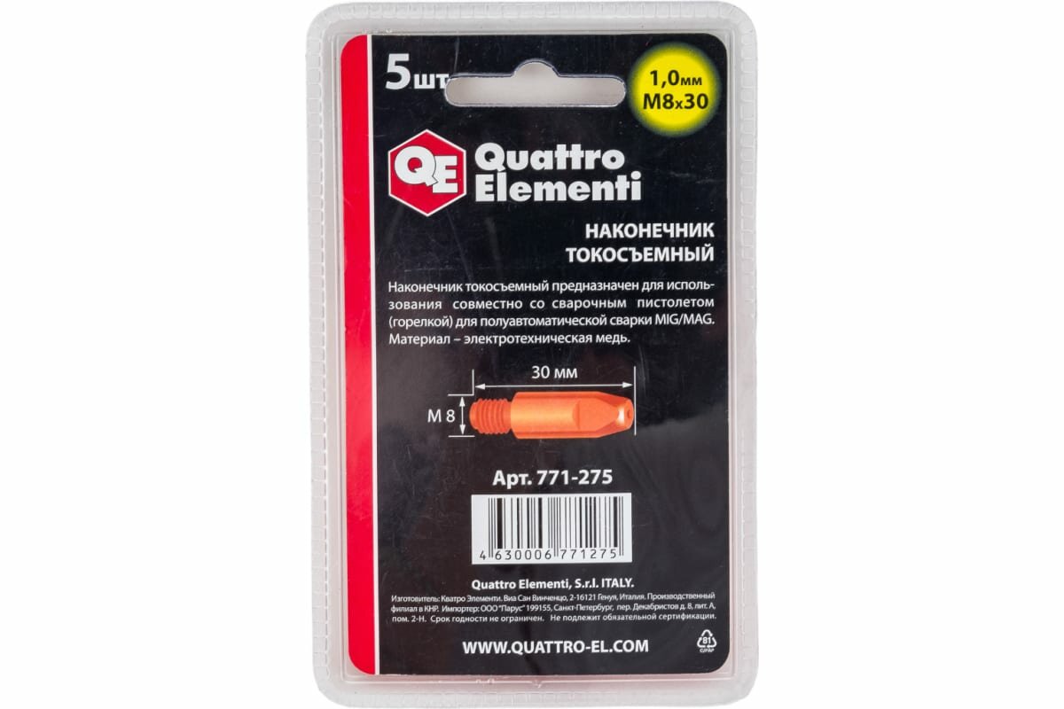 На сегодняшний день товар «Токосъемный наконечник для горелки полуавтомата QUATTRO ELEMENTI M8x30 М8х30 мм, 1 мм» можно купить с кешбеком в 1 магазине: Яндекс.Маркет