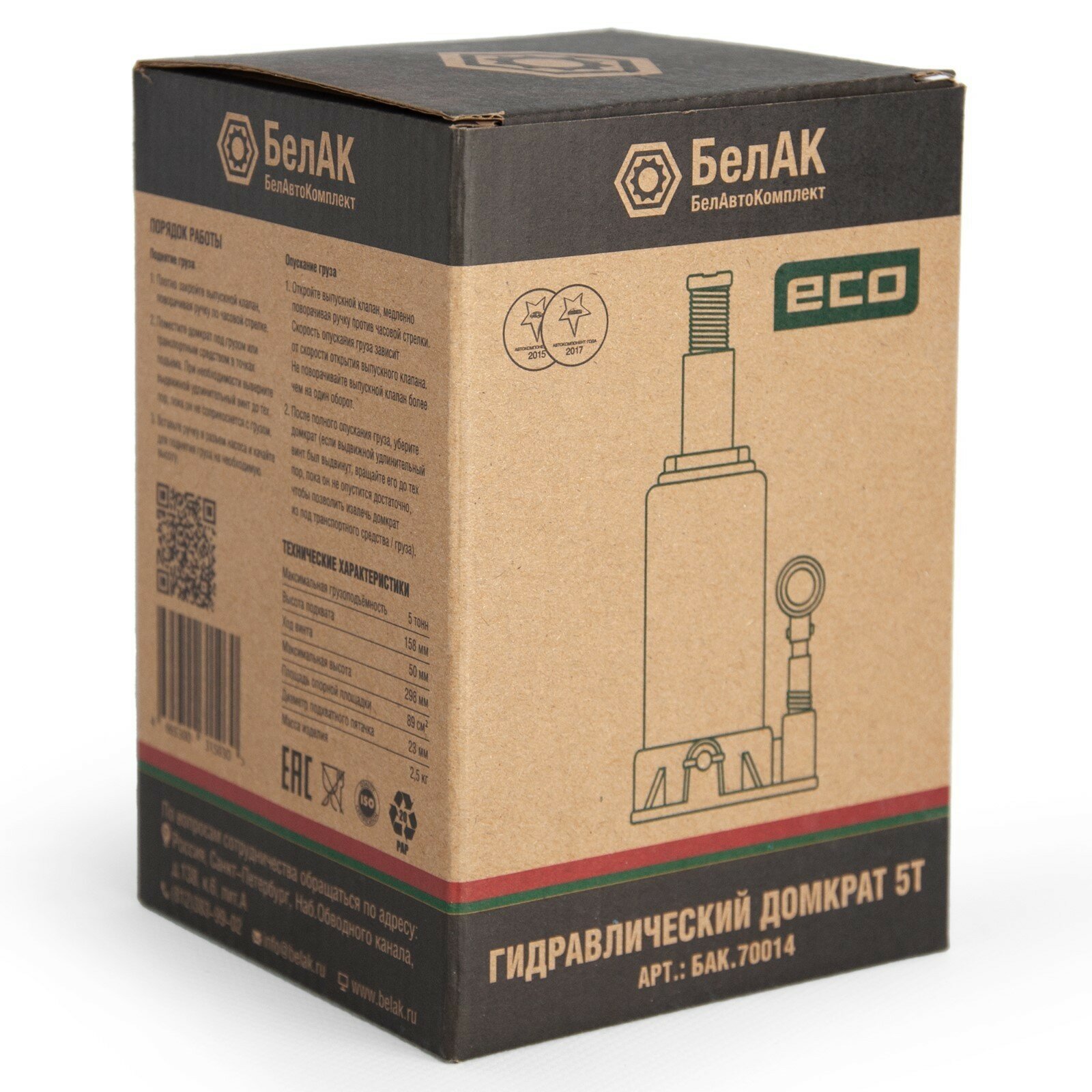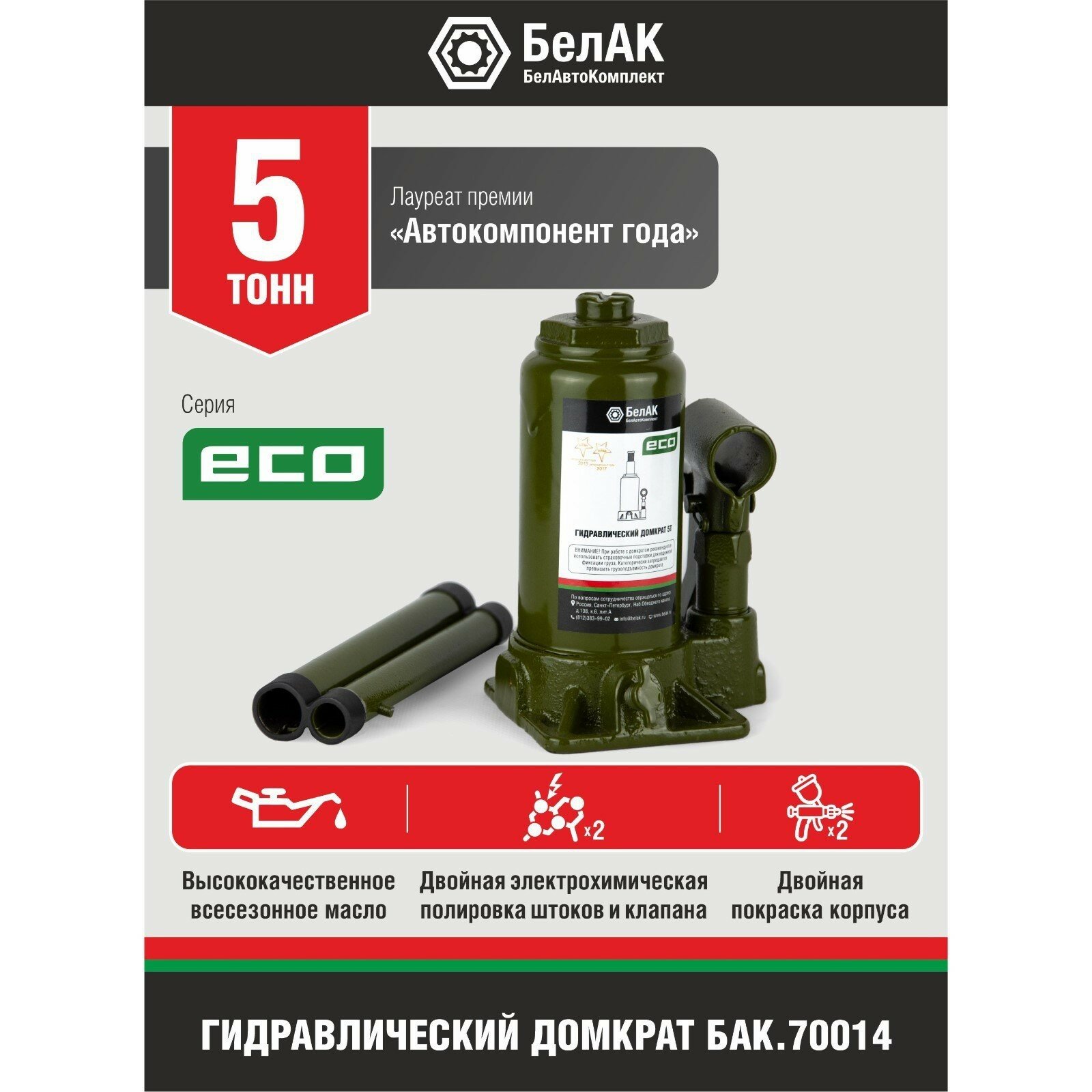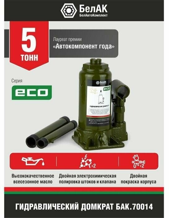 Домкрат ECO 5 тонн «БелАК» разработан российским производителем «БелАК», награждённым двумя национальными премиями «Автокомпонент года» и «Автоаксессуар года» за высокое качество и надежность выпускаемых домкратов. Продукция «БелАК» соответствуют нормам сертификации ISO9001 и ЕАС.