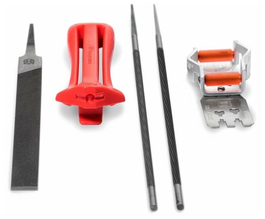 Заточной набор облегчает подготовку пильной цепи к работе. Правильная заточка цепи облегчит вашу работу и повысит безопасность. Заточной набор содержит рукоятку для напильника, комбинированный шаблон или шаблон для заточки и ограничитель глубины реза, а также один плоский напильник.