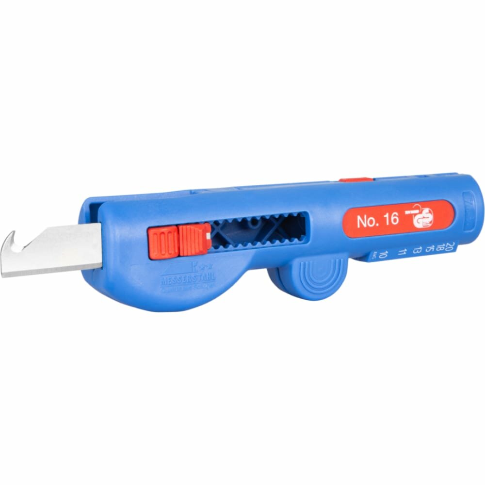 Универсальный инструмент № 16 QUADRO для снятия ПВХ-оболочки кабелей и ПВХ-изоляции проводов и жил.Снятие ПВХ-оболочки кабеля: 1. Для круглых кабелей диаметром 8-13 мм(например, для NYM – от 3х1,5 до 5х2,5 кв. мм). 2. Два узла для надрезания оболочки – для поперечного и продольного реза. Удобен для работы в местах с затрудненным доступом – в разветвительных коробках, в распределительных шкафах и т. д.Снятие ПВХ-изоляции проводов и жил: 1. Для снятия изоляции гибких проводников и проводов со сплошными жилами сечением 0,5/0,75/1,5/2,5/4,0/6,0 кв. мм.