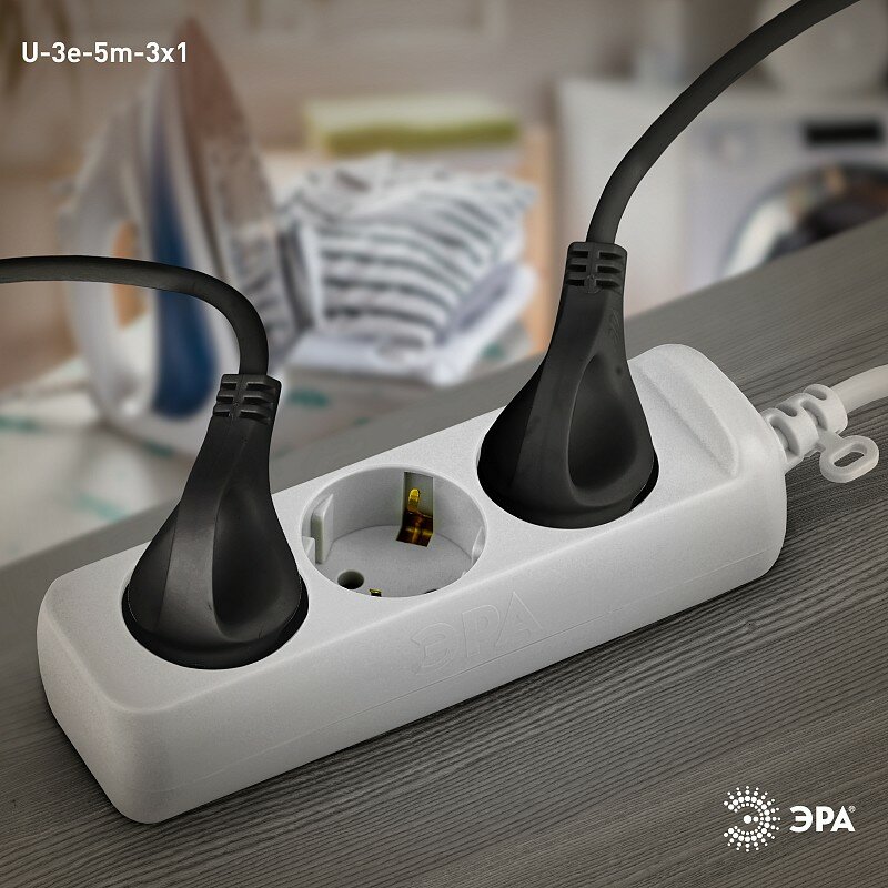 Удлинитель электрический Эра U-3e-5m с заземлением, ПВС, 3x1мм2, 3 розетки, 5м. Рассчитан на максимальную мощность 16А/3500 Вт. Удлинитель Эра станет Вашим надежным помощником, если Ваши любимые электроприборы находятся далеко от розеток. Провод в удлинителях Эра сделан из 100% меди, что делает его абсолютно пожаробезопасным. Корпус выполнен из ударопрочного и негорючего пластика (полипропилен). В моделях с заземлением у вилки есть кольцо для удобного извлечения из розетки. Модель удлинителя на 16А позволяет подключить мощные бытовые приборы общей нагрузкой до 3500Вт. Не бойтесь включить чайник, обогреватель, микроволновку или другие электроприборы. Толстый провод удлинителя Эра гарантирует полную безопасность. Дизайн удлинителя разработан в России командой Эра Style.