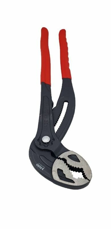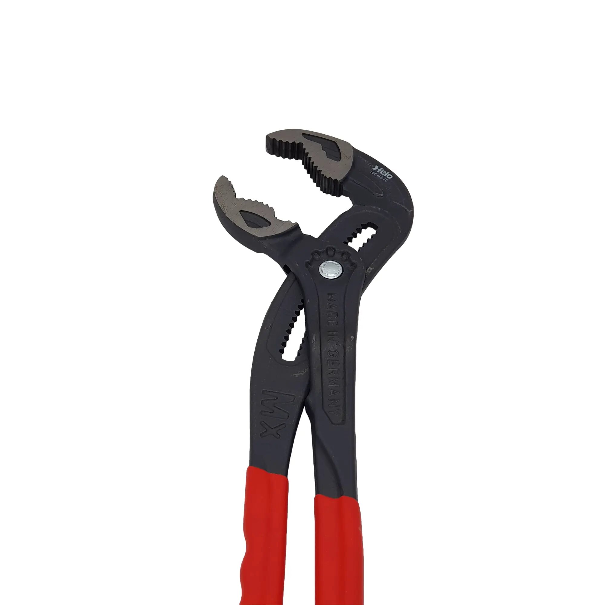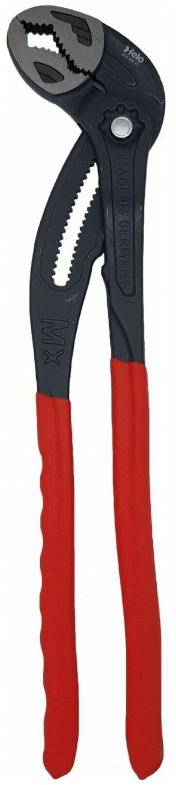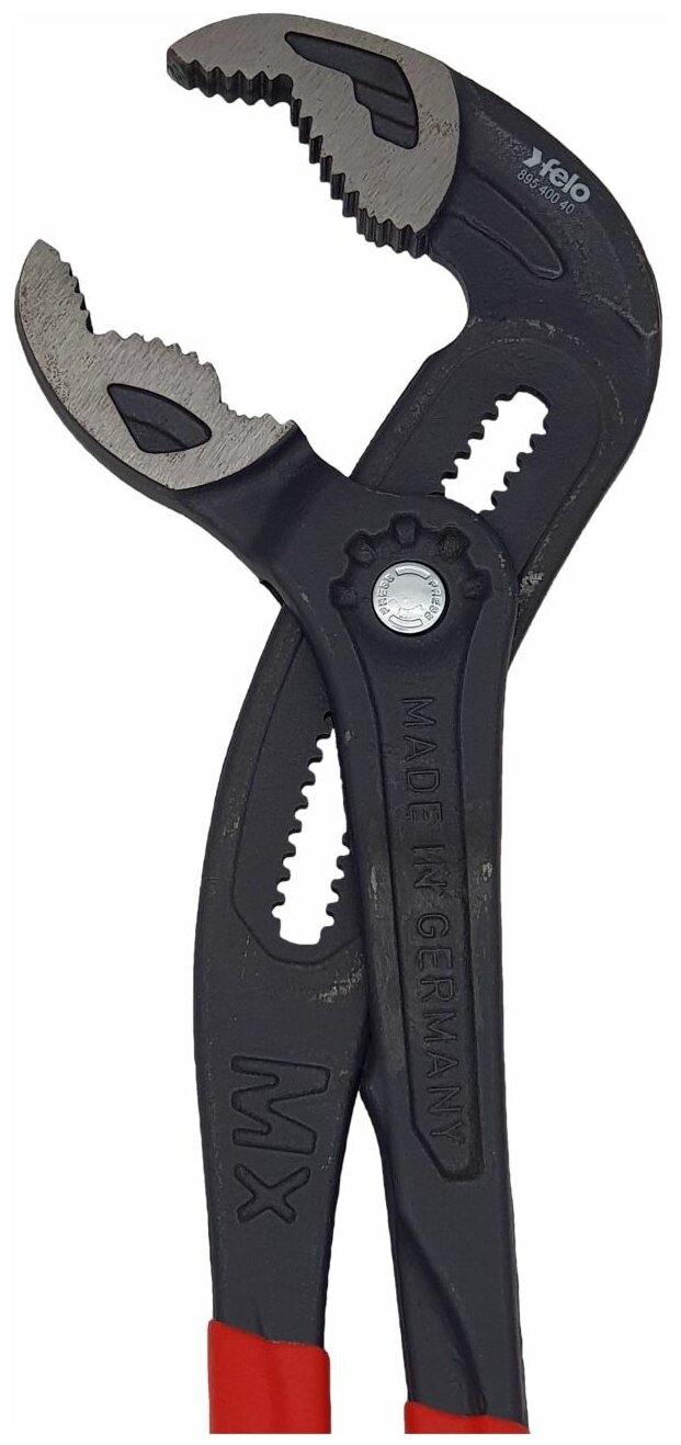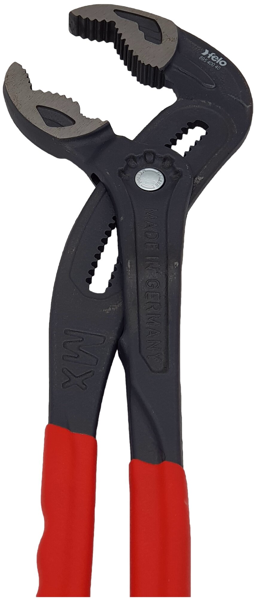 Клещи переставные Felo подходят для работы с разными деталями при проведении слесарных, монтажных, сантехнических работ, а также в строительстве для зажатия, зажима и обжатия заготовок. Кнопочный механизм предусматривает 24 положения. Зев раскрывается на максимальное расстояние в 100 мм. Фиксация размера происходит нажатием на кнопку, которая полностью исключает нечаянную перестановку размера ключа. Зубчатая форма губок внутри предотвращает соскальзывание инструмента. При изготовлении деталей используется хромованадиевая сталь, прошедшая закаливание в масле. Ручки выполнены из пластика.