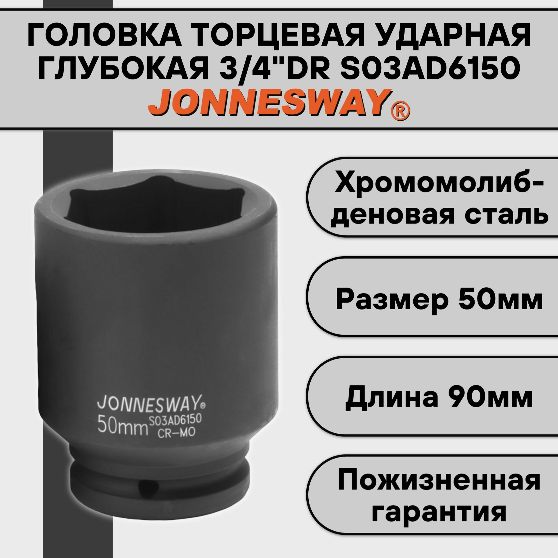 Головка ударная Jonnesway размер 50мм, h 90мм, s 3/4'' (s03ad6150)