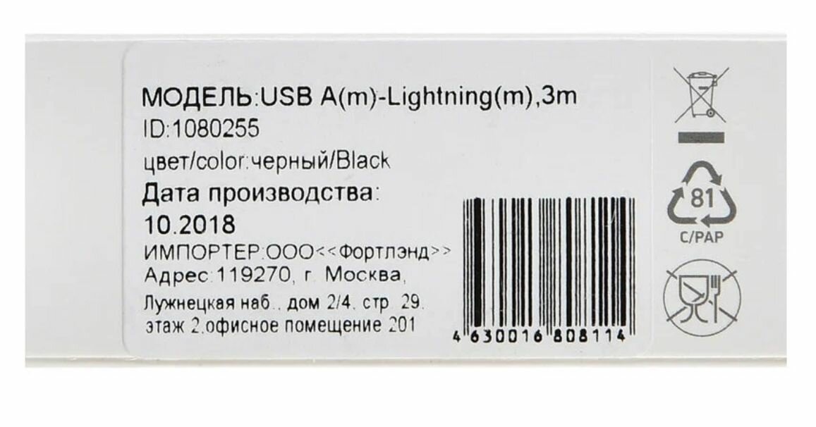 | Прочие особенности и свойства | Кабель для зарядки и синхронизации смартфонов и планшетов с разъемом Lightning. |