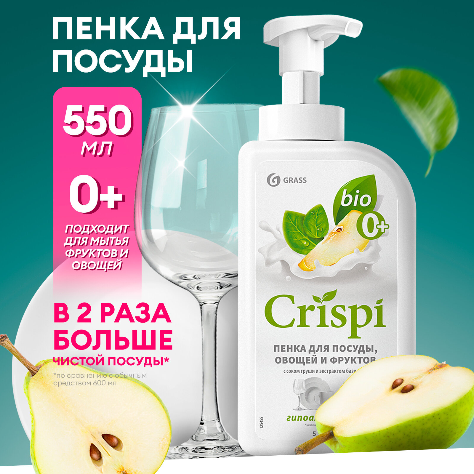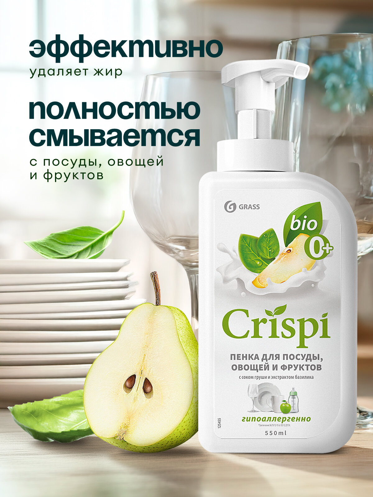 **Средство для мытья посуды Grass Crispi «Пенка»** с соком груши и экстрактом базилика сохраняет молодость рук. Подходит для мытья фруктов и овощей. Эффективно очищает даже в холодной воде. Не содержит красителей, состоит на 99% из растительных ингредиентов