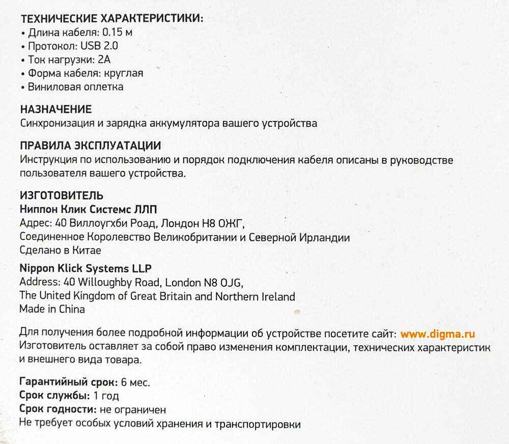 | Описание | Кабель предназначен для передачи данных между мобильными устройствами и компьютером, а также для зарядки мобильного устройства от USB порта компьютера или сетевого зарядного устройства. |