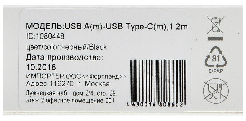 | Тип разъема | USB 2.0 A вилка/Type-C вилка |