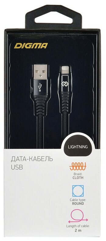 Кабель Lightning 2м Digma круглый черный 1084576