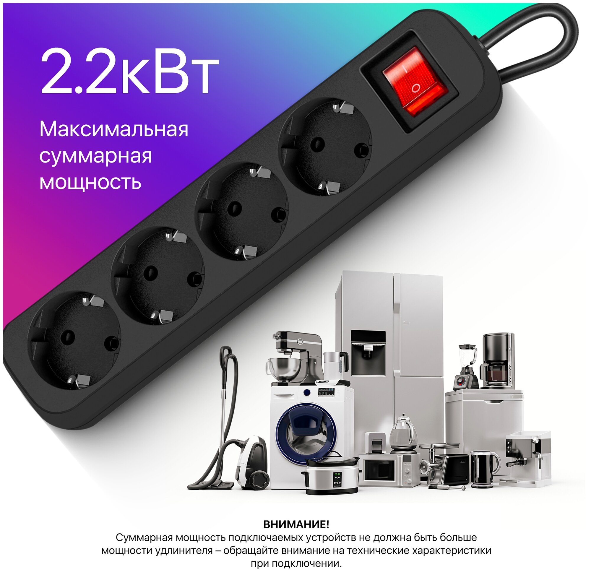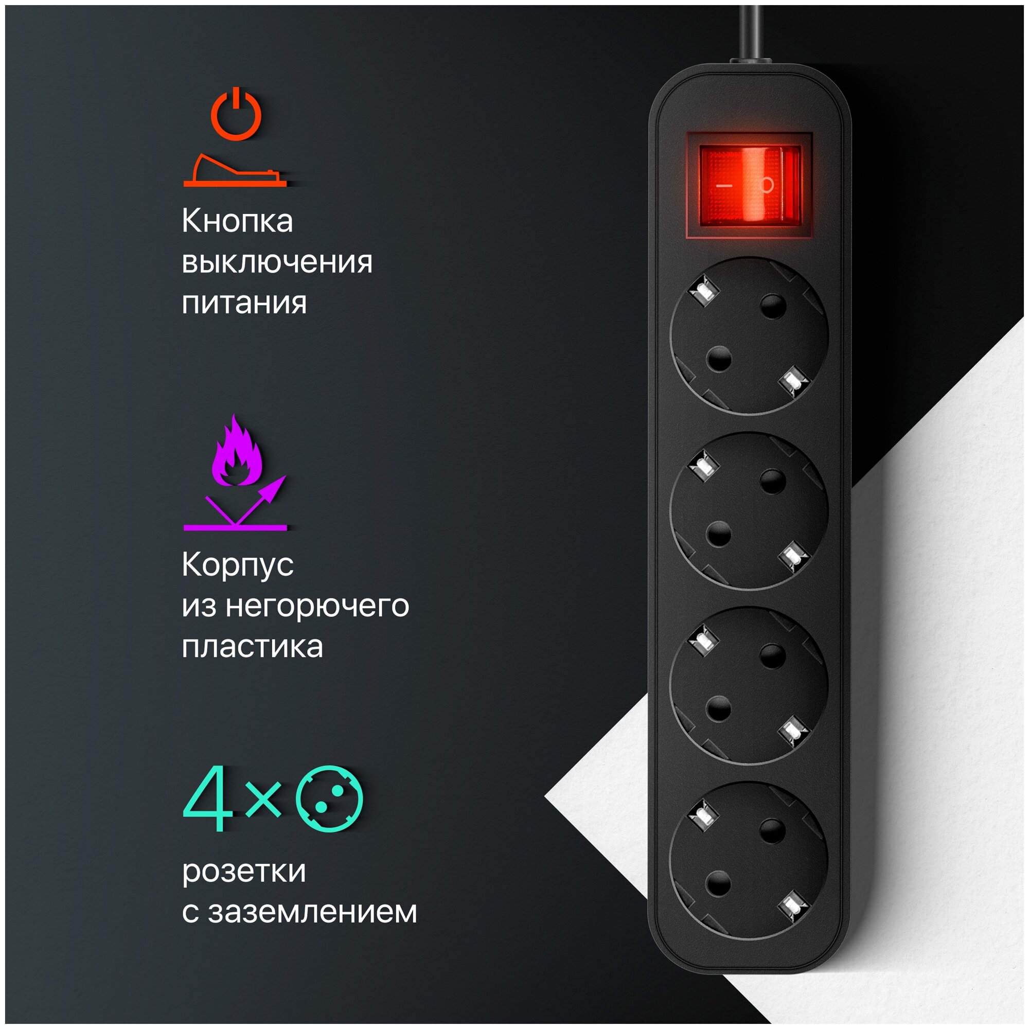 | Прочие особенности и свойства | 4 розетки с заземлением, Выключатель питания, Корпус из негорючего пластика, Индикатор сети |