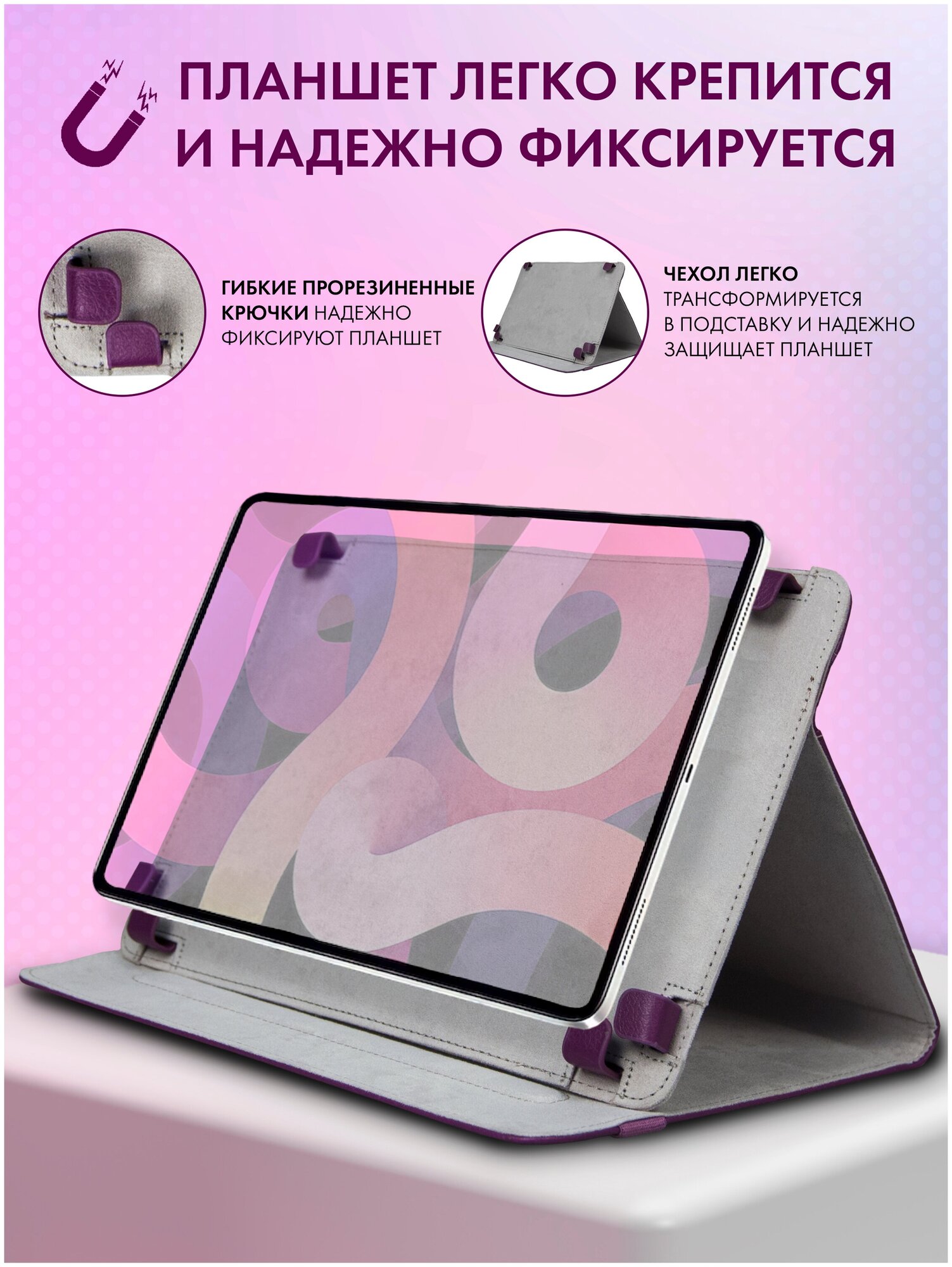 Универсальный чехол-книжка для планшета с диагональю 9,7 дюйма. Легко трансформируется в надёжную и удобную подставку. Крепление на гибких прорезиненных металлических крючках. Чехол надежно закрывается дополнительной резинкой и не откроется даже в случае падения. Настольную подставку под планшет наиболее часто покупают для защиты планшета ребёнка или планшета для взрослых. Искусственная кожа выглядит очень натурально, мягкая - как настоящая кожаная, при этом долго сохраняет первозданный внешний вид. Планшет с чехлом легко помещается в кейс или сумку. Наш чехол отлично подходит для любой модели планшета с диагональю 9,7". Вот список наиболее популярных моделей планшетов, с которыми сочетается наш чехол: HUAWEI MatePad T 10 32Gb LTE, HUAWEI Mediapad T3 10, Samsung Galaxy Tab E 9.6 SM-T561N, Apple iPad (2018), Irbis TZ969, Prestigio Wize PMT3096, DIGMA Plane 9654Mipad air 2Huawei MatePad T 10sprestigio pmt 5791 4gHuawei MediaPad T3 10Lenovo Tab M10Huawei mate pad t103Q Q-Pad RC9713BSamsung Galaxy Tab 4 10.1Samsung Galaxy Tab E 9.6 SM-T561N (2015)Sunwind SKY 9E201BQ-9055L Exion Pro MiniIpad 2Ipad 3Ipad 4