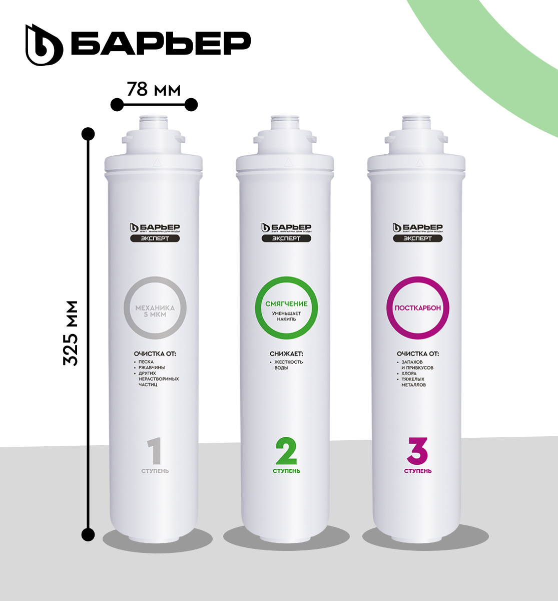 | Описание | Фильтроэлемент «Механика» очищает воду от песка, ржавчины, окалины, механических частиц. Фильтроэлемент «Смягчение» очищает воду от солей кальция, солей магния. Фильтроэлемент «Посткарбон» очищает воду от ионов тяжелых и токсичных металлов, растворенного железа неприятных запахов, привкусов. |