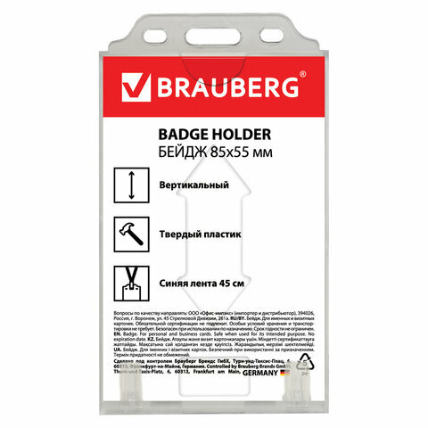 Бейдж BRAUBERG (БРАУБЕРГ) 84х55 мм вертикальный твердый пластик на синей ленте 45 см 232139