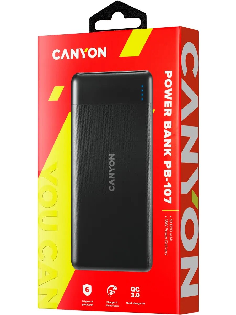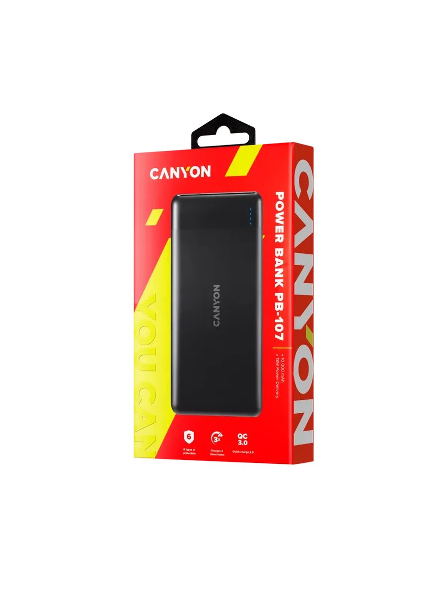 CANYON Power bank 10000mAh Li-poly battery Input Micro/PD 18W(Max) Output PD/QC3.0 18W(Max) quick charging cable 0.3m 144*68*16mm 0.25kg Black PB-107