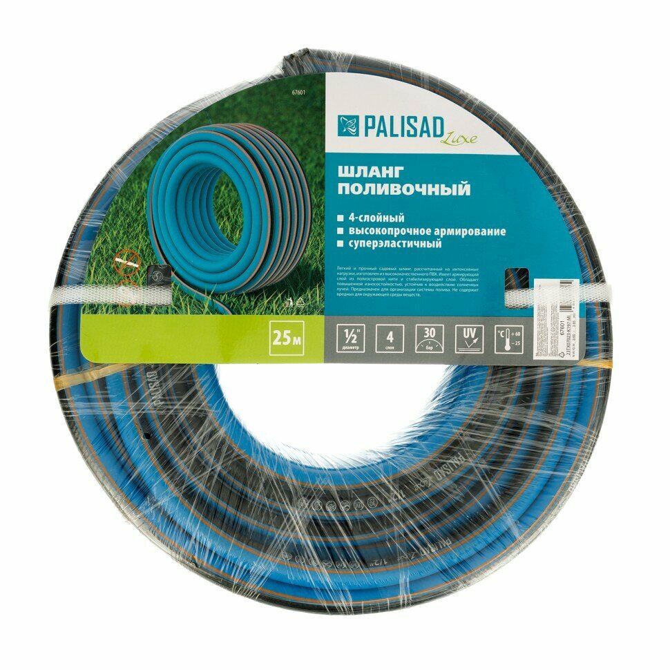 | Прочие особенности и свойства | Предназначен для орошения почвы на садовых и парковых участках., Изготовлен из ПВХ cамого высокого качества., Материал армирующего слоя - суперпрочная полиэстерная нить., Высокая эластичность и защитное покрытие «Soft Touch» обеспечивают устойчивость изделия к повреждениям и ультрафиолетовым лучам., Рассчитан на эксплуатацию в условиях повышенной (интенсивной) нагрузки., Имеет длительный срок использования., Максимальная нагрузка - 30 бар., Диапазон рабочих температур от –25 до +60 °С., Не содержит вредные для окружающей среды вещества., Совместим со всеми элементами системы полива Palisad и Palisad Luxe. |