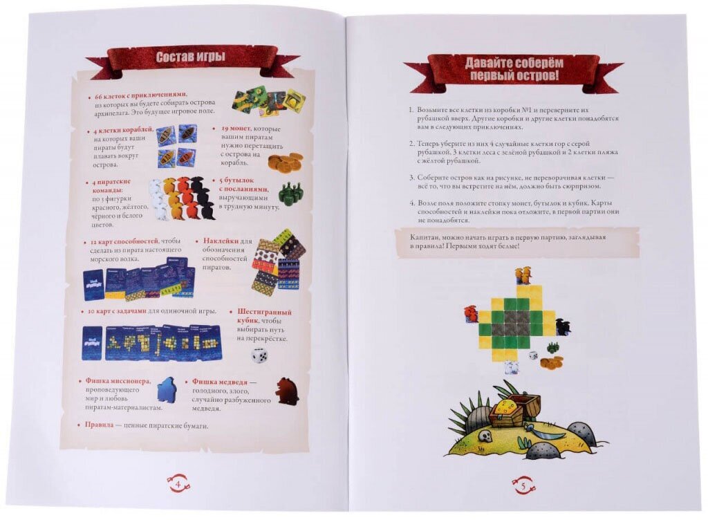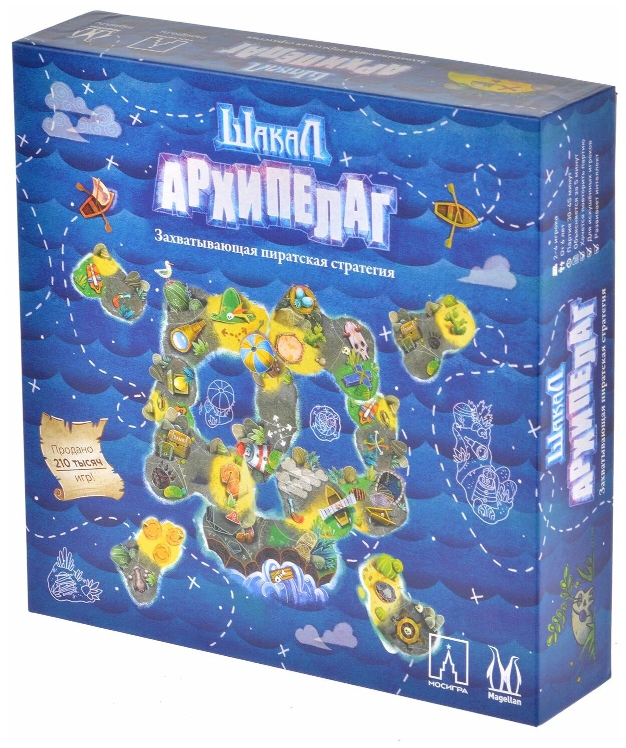 К каждому острову одновременно подплывает несколько кораблей. Один из них с вашими пиратами, а остальные — с пиратами других игроков. На каждом корабле по три морских волка. Вы высаживаете их на остров и начинаете ходить по твёрдой земле. Сначала остров вообще не разведан. Каждый раз, когда вы наступаете на одну из клеток, вы переворачиваете её, и смотрите, что там. Там может оказаться долгожданное сокровище или какое-нибудь приключение. Задача — найти клады капитана Шакала и забрать золото на свой корабль.Что поменялось в «Архипелаге»:Острова меньше. Очень многие писали, что разведывать остров, конечно, здорово, но хотелось бы битв и динамики с первых ходов. Ну а теперь уже на третьем ходу у вас будет шанс настучать по голове вражескому пирату.Случайности стало меньше. Мы, конечно, не раз пытались математически доказать, что на победу в обычном «Шакале» случайность не влияет, но всё равно вид сундука с пятью монетами прямо у вражеского корабля заставлял дико завидовать. Поэтому теперь каждый остров состоит из трёх слоёв: береговая линия, где безопасно и спокойно, но почти нет золота; затем джунгли, где денег и опасностей больше; и горы, где всего в избытке. Горы всегда в центре, вокруг них джунгли, а дальше — берег.Партия стала короче. Маленький остров — коротая игра. Можно уложиться и в 15 минут. Самый большой остров — примерно час игры.Понятнее правила. Всё осталось как было по тактической глубине, но мы перебрали правила и сделали так, что на первых двух островах не встречается ничего сложного из клеток. В результате вы просто берёте корабль с командой и играете. Начать стало очень просто.Глубже стратегия. Для любителей долгих игр мы сделали особенную вещь — теперь пираты между островами умеют учиться и получать специальные навыки. Например, охотник умеет перепрыгивать ловушки, а пират с динамитом взрывается, когда его бьют, в результате чего нападать на него как-то боязно. В дополнительных правилах вы также найдёте правила абордажа.Дружелюбнее к детям. Пираты немыслимы без рома или грога: без спиртов вода быстро портилась, поэтому моряки консервировали её как могли. Это было тяжёлое время, поэтому могли только так. К сожалению, упоминание алкоголя дало игре возрастной маркер 16+. Теперь игра снова 6+, потому что вместо рома — бутылки с посланиями. Пират как начитается посланий, так сразу становится сильнее, выше и быстрее.Поменялись фигурки. Они теперь очень классные: фигурные из дерева. Особенно мишка.Появилось несколько новых клеток — тут всё как обычно. В наборе почти нет пустых клеток в сравнении с базовым Шакалом.Много мелких доделок правил и изменений баланса. Например, самолёт, который вызывал огромное количество вопросов, теперь можно использовать только сразу как продолжение хода.Добавились одиночные миссии: 10 карточек тактических задач, в которых вам нужно разобраться самому. Это на тот случай если вы, как старый пират, победили уже всех своих друзей.И, конечно, обновилась художественная часть. Татьяна.
