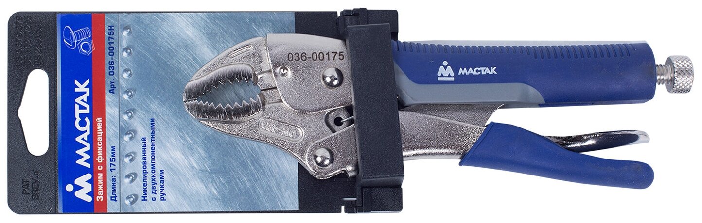 Зажим с фиксатором МАСТАК с закруглёнными фигурными губками применяется для зажима деталей и конструкций при сварочных работах в автомастерских. Общая длина - 175 мм. Винт на рукоятке позволяет подогнать размер зева под место захвата.