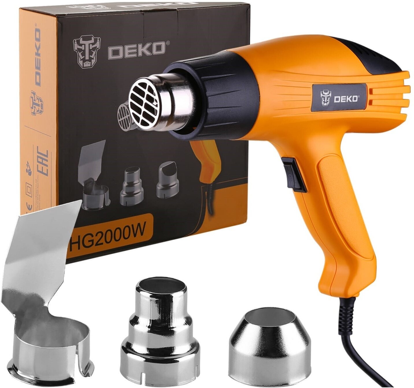 Строительный фен DEKO HG2000W, 2000Вт, 2 скорости, защита от перегрева 063-4166 используется для широкого спектра задач: формование/сварка изделии? из ПВХ, полистирола, акрилового пластика, плексигласа, сушки красок, заливочных масс, клеев, удаление герметиков, лакокрасочных/ковровых покрытии?, обоев, для усадки термоусадочных шлангов, размораживания.