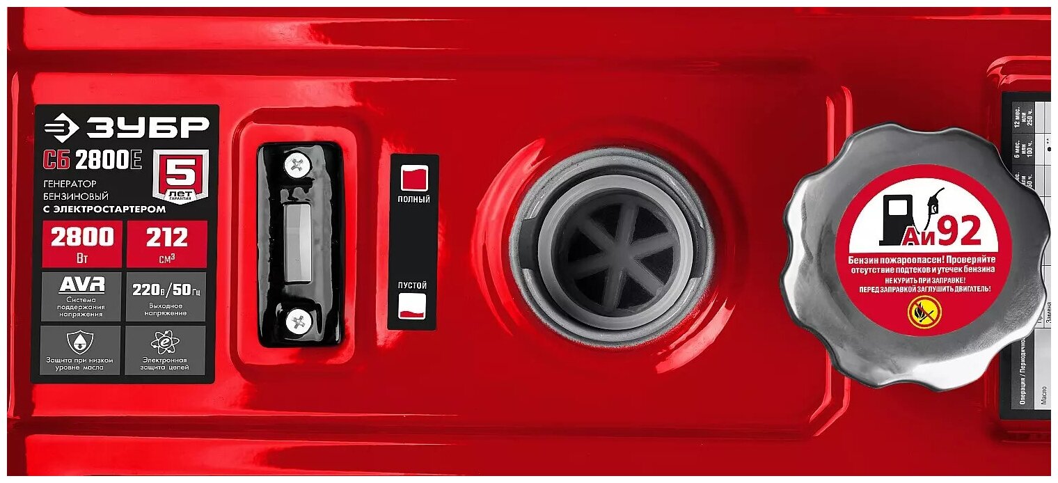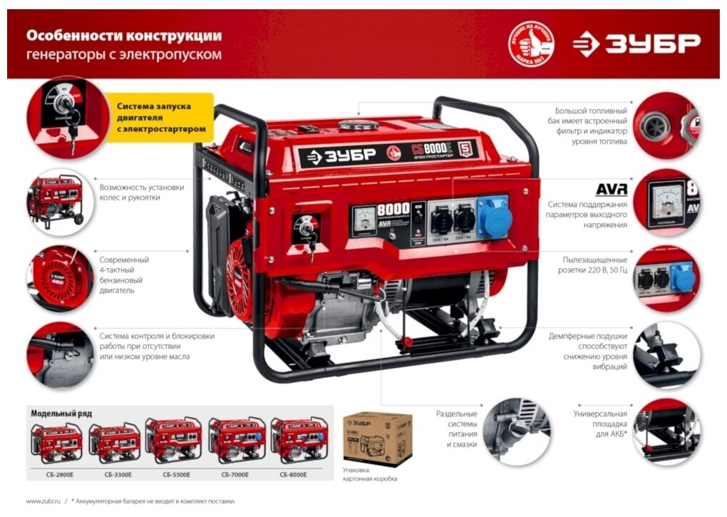 Оптимальный по мощности генератор - может обеспечить практически любой потребитель в загородном доме во время перебоев с электроснабжением или служить дополнительным источником энергии при ограниченной мощности сети. Электрический стартер облегчает запуск, особенно в зимнее время. Высокий ресурс, низкое потребление топлива и повышенная надежность - основные достоинства генераторов ЗУБР. Аккумуляторная батарея не входит в комплект поставки. Емкость батареи не менее 7 А*ч.