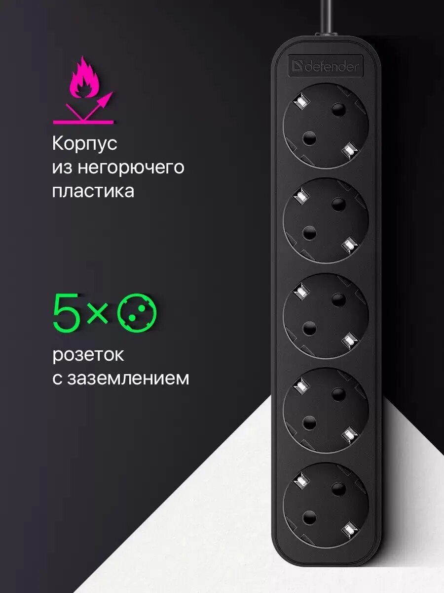 | Прочие особенности и свойства | 5 розеток с заземлением,Корпус из негорючего пластика |