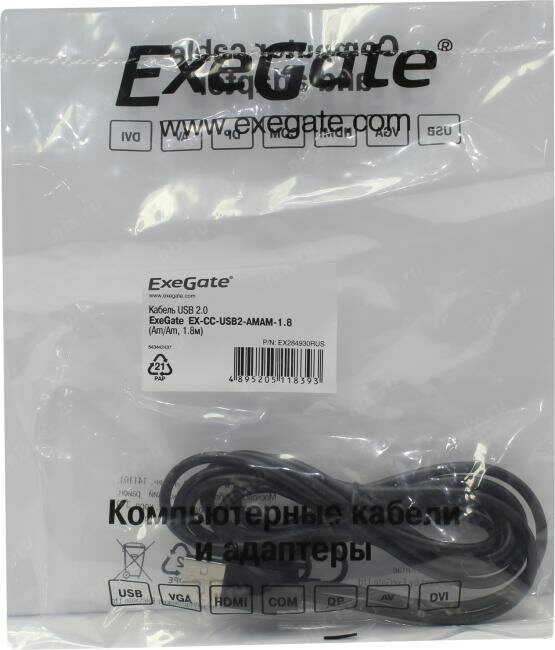 | Прочие особенности и свойства | Exegate EX284930RUS Кабель USB 2.0 ExeGate EX-CC-USB2-AMAM-1.8 (Am/Am, 1,8м) |