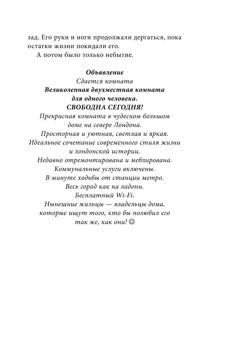 Лиза, девушка с тяжелым прошлым, не верит своей удаче, когда находит уютную комнату в красивом доме, еще и по разумной цене. Хозяева — добрая и приветливая пара. И все кажется идеальным, пока она не находит в спальне предсмертную записку. По словам владельцев, Лиза — их первый арендатор, а записка — ошибка или чья-то злая шутка.