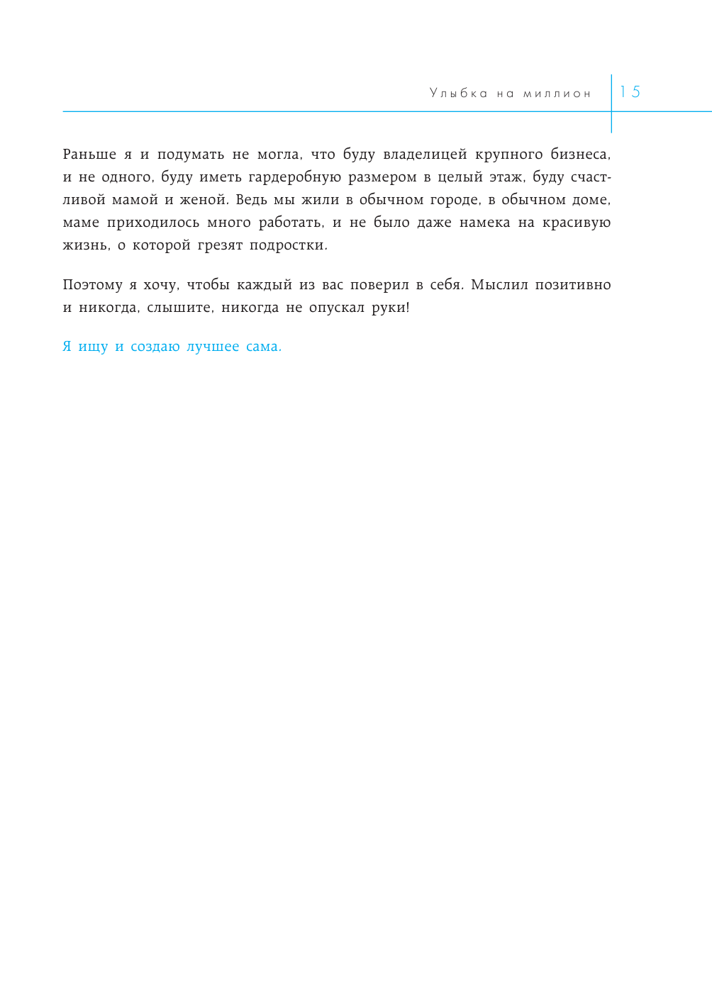 Никогда не предполагала, что книгу про «успешный успех» прочту на одном дыхании. Здесь не просто рассказ о детстве, юности автора, в книге есть все необходимые кейсы, как прокачать себя и свой бизнес. Очень привлекли главы о франшизе и сети косметического отбеливания зубов, которую создала Мария.